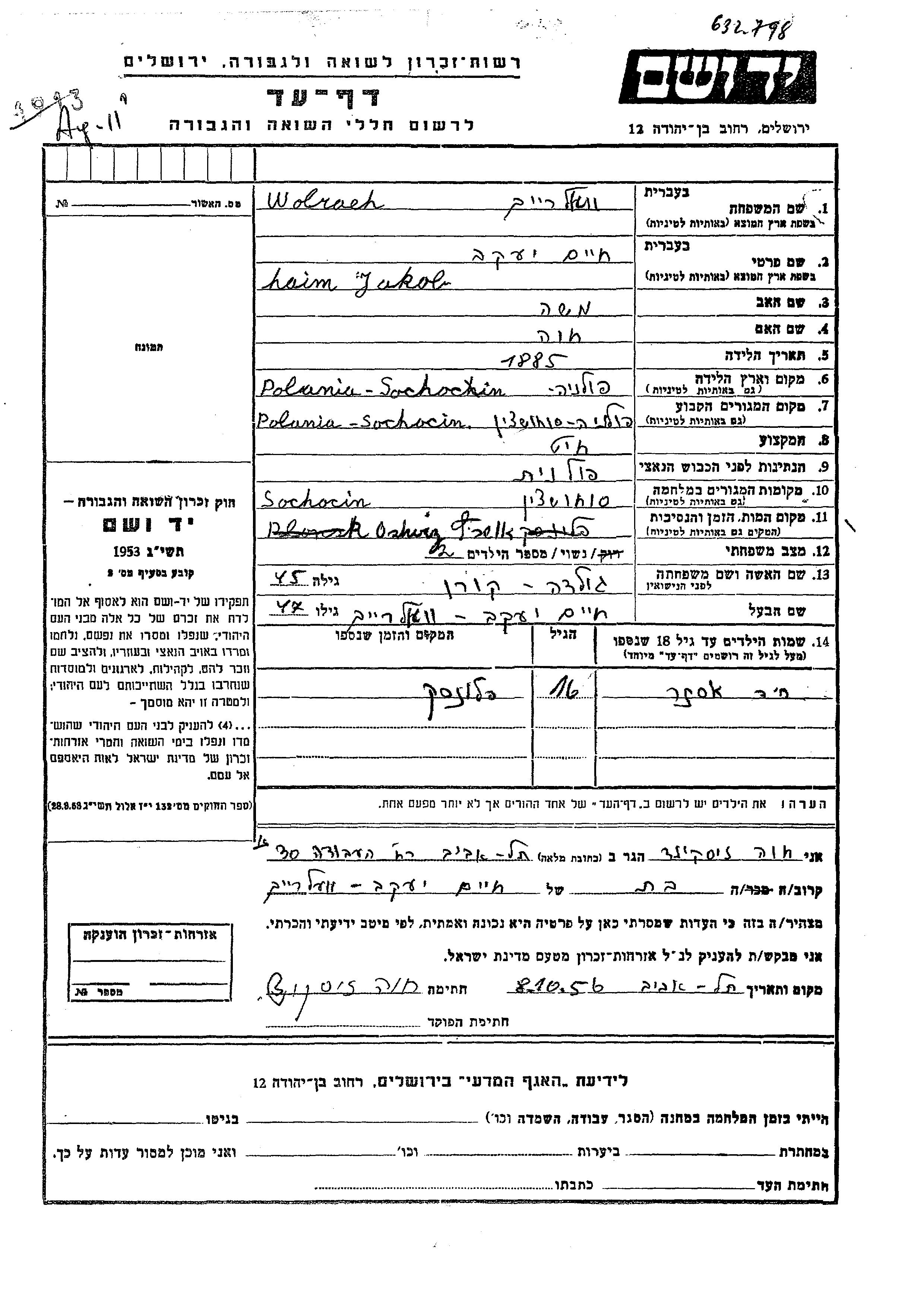 Хаим Якоб Вольрах, место рождения: Сохоцин, Польша. Отец: Моше, mать:Хава. Портной / портниха. Женат / замужем. Место жительства до войны: Сохоцин, Польша. Место во время войны: Сохоцин, Польша.