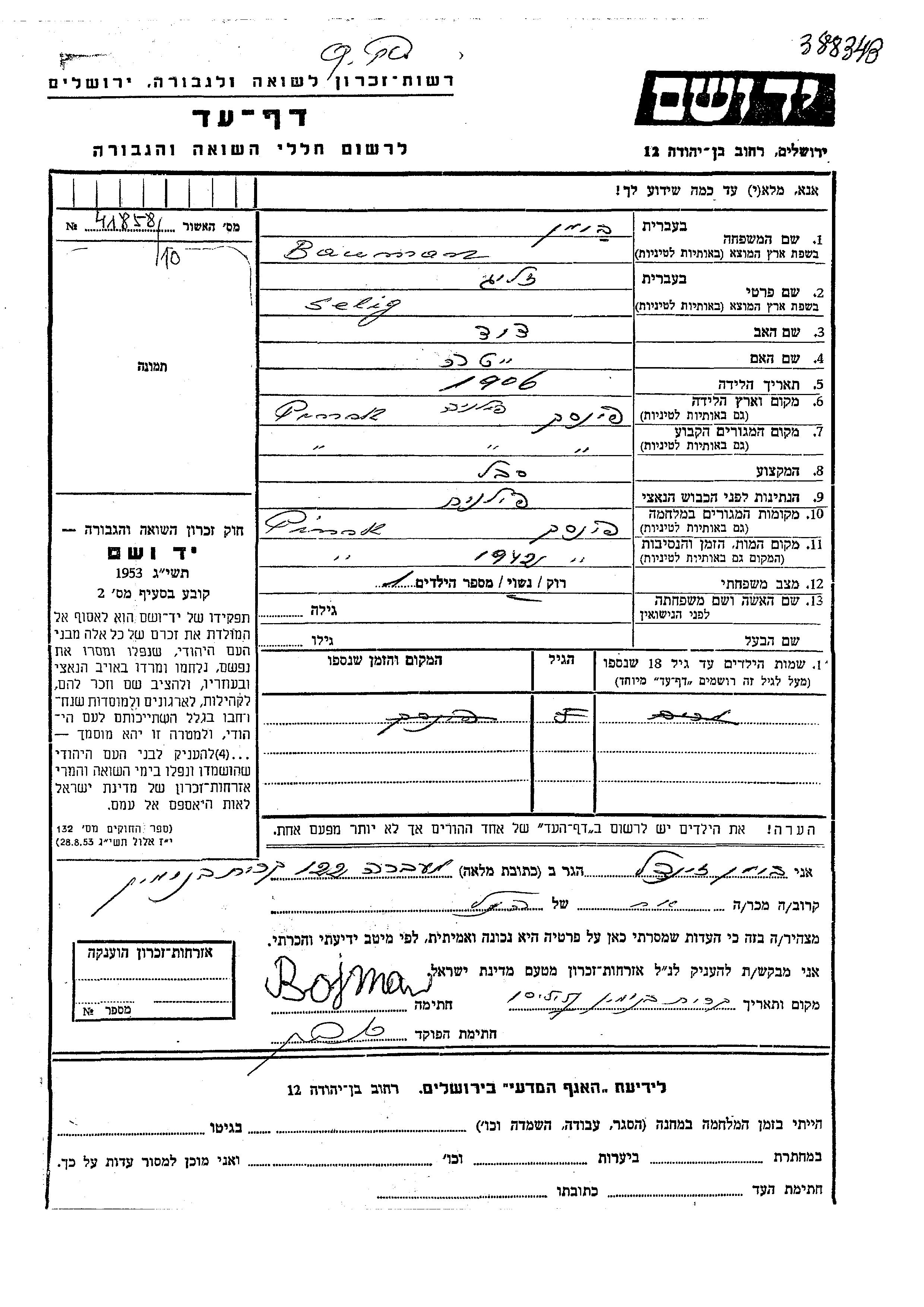 Зелиг Бауман, место рождения: Пинск, Польша. Отец: Давид, mать:Ита. Грузчик. Женат / замужем. Место жительства до войны: Пинск, Польша. Место во время войны: Пинск, Польша.