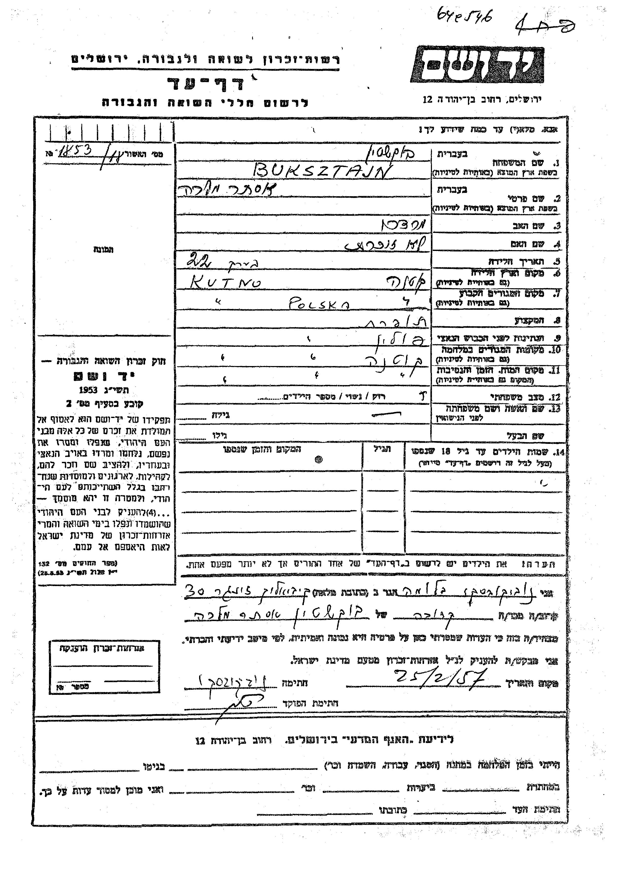 Букштайн Эстер Малка Кутно, Польша Лист свидетельских показаний