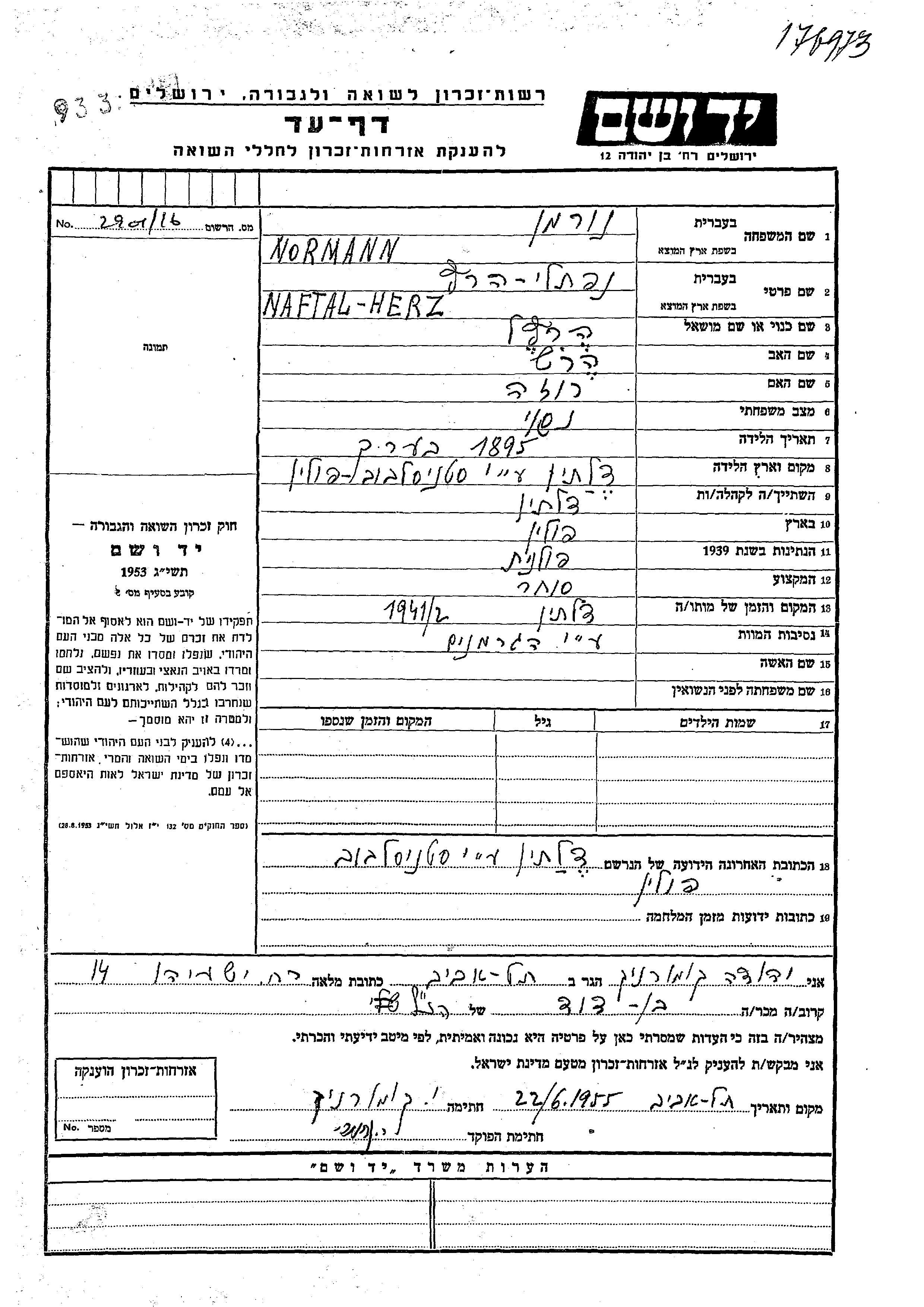 Нафтали Херц Херцль Норманн Нурман, место рождения: Делятин, Польша. Отец: Герш, mать:Роза. Торговец / торговка. Женат / замужем. Место жительства до войны: Делятин, Польша.