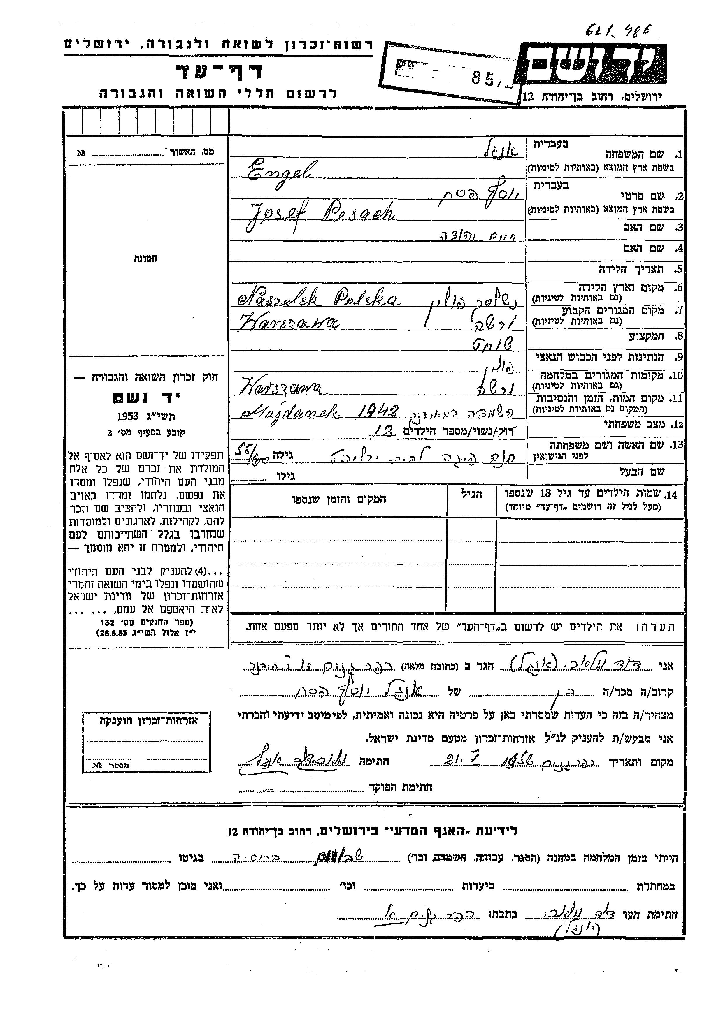 Энгель Йосеф Песах Варшава, Польша Лист свидетельских показаний