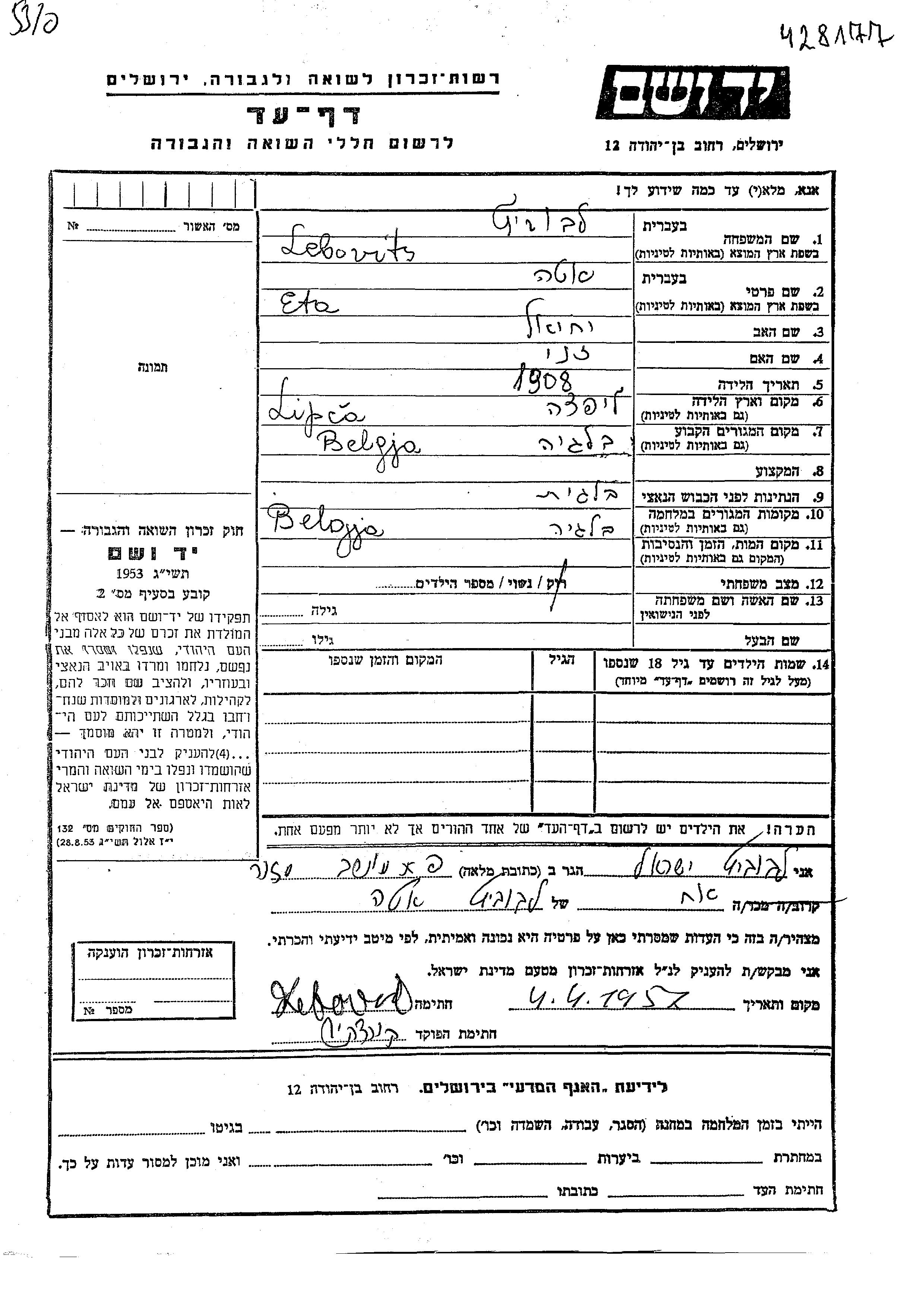 Эта Лебовиц, место рождения: Липча, Чехословакия. Отец: Иехиэль, mать:Жени. Женат / замужем. Место жительства до войны: Бельгия. Место во время войны: Бельгия.