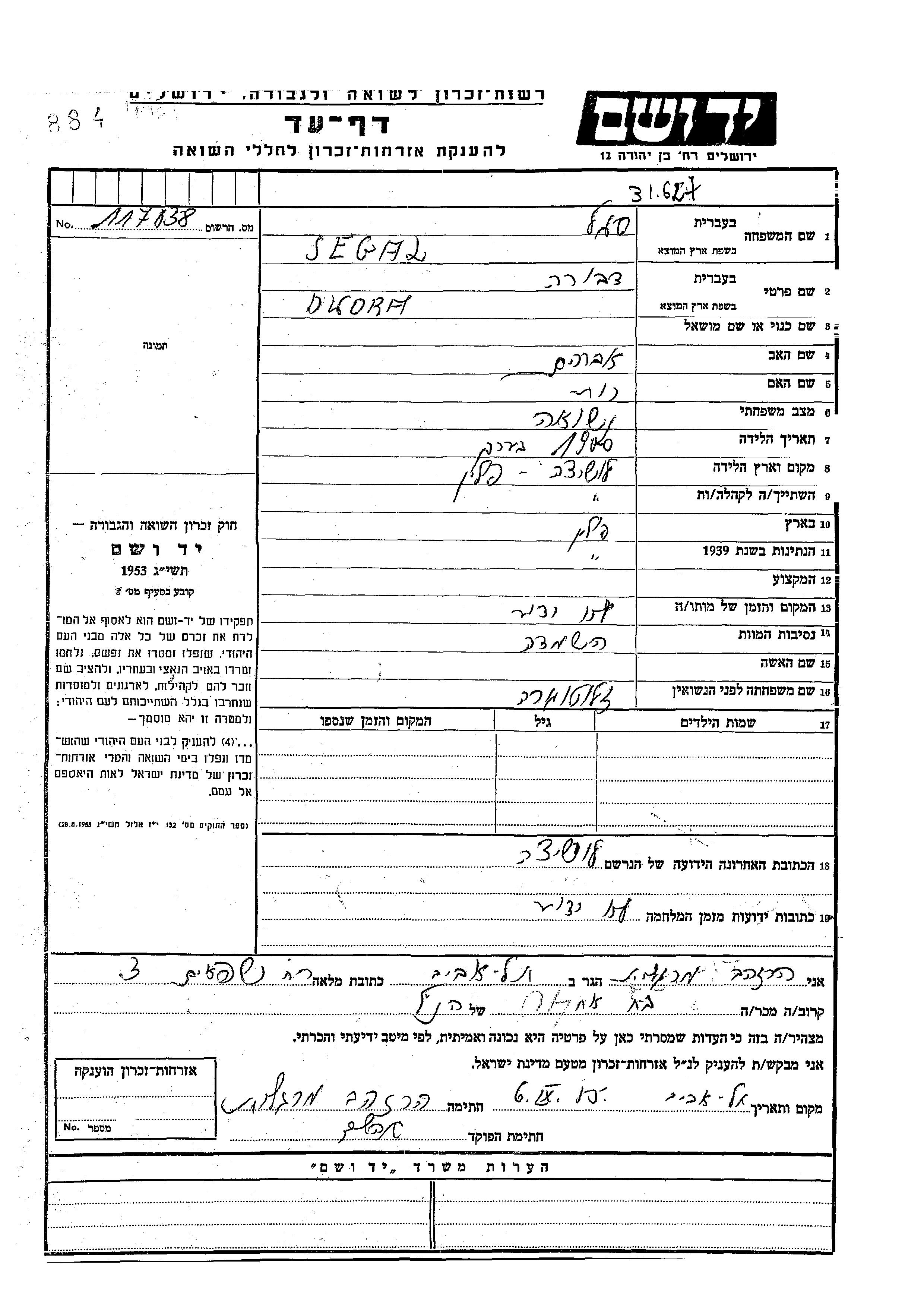 Двора Сегаль, девичья фамилия Злотогора, место рождения: Лосице, Польша. Отец: Авраам, mать:Рут. Место жительства до войны: Лосице, Польша.