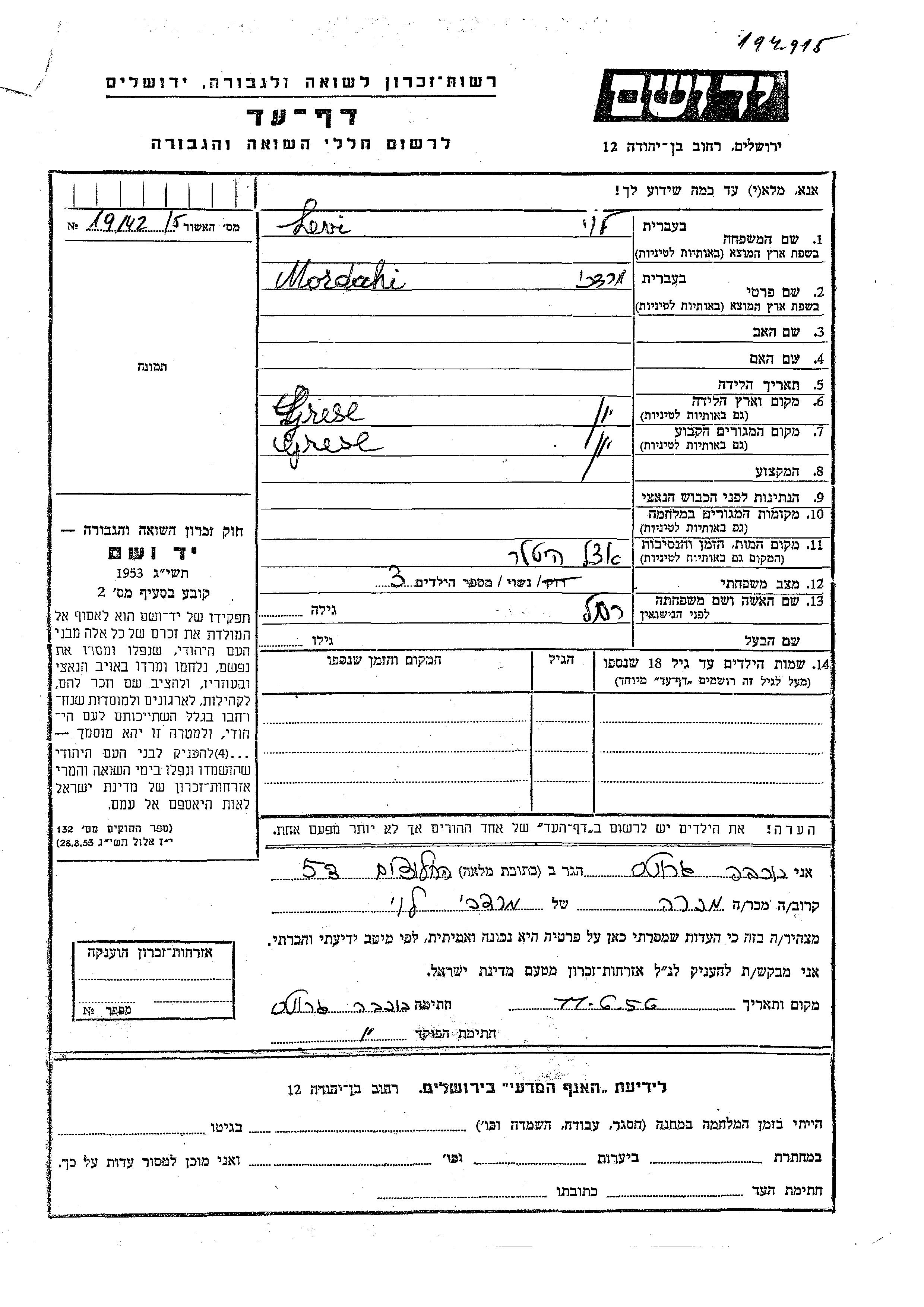 Мордехай Леви, место рождения: Греция. Женат / замужем. Место жительства до войны: Липтовский-Микулаш, Чехословакия.