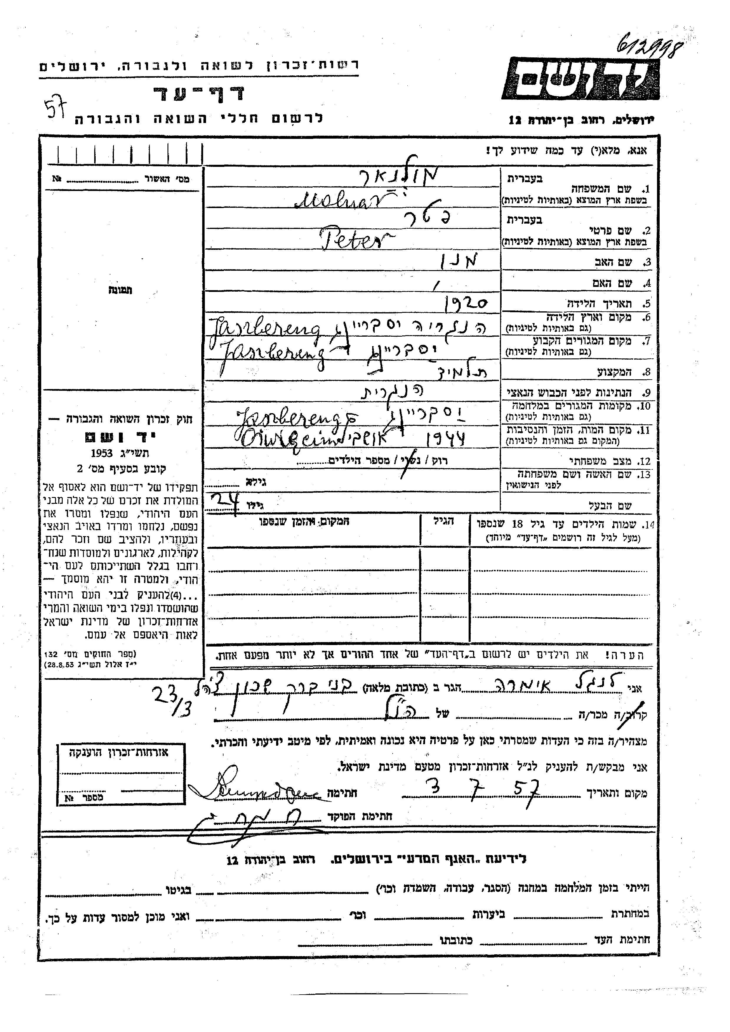 Петер Мольнар, место рождения: Ясберень, Венгрия. Отец: Мано. Ученик / ученица. Холост / не замужем. Место жительства до войны: Ясберень, Венгрия. Место во время войны: Ясберень, Венгрия.