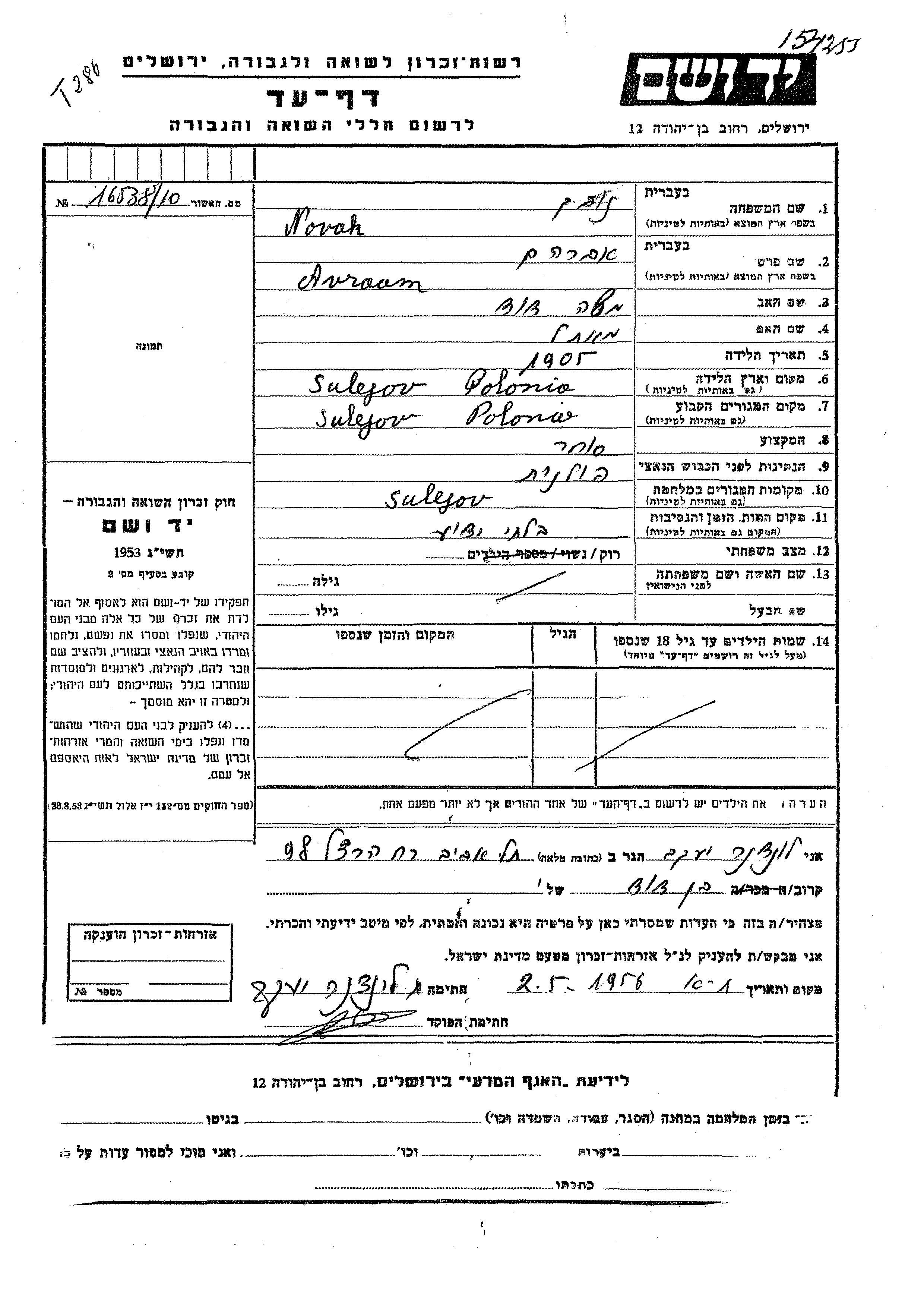 Авраам Новак, место рождения: Сулеёв, Польша. Отец: Моше Давид, mать:Матель. Торговец / торговка. Холост / не замужем. Место жительства до войны: Сулеёв, Польша. Место во время войны: Сулеёв, Польша.