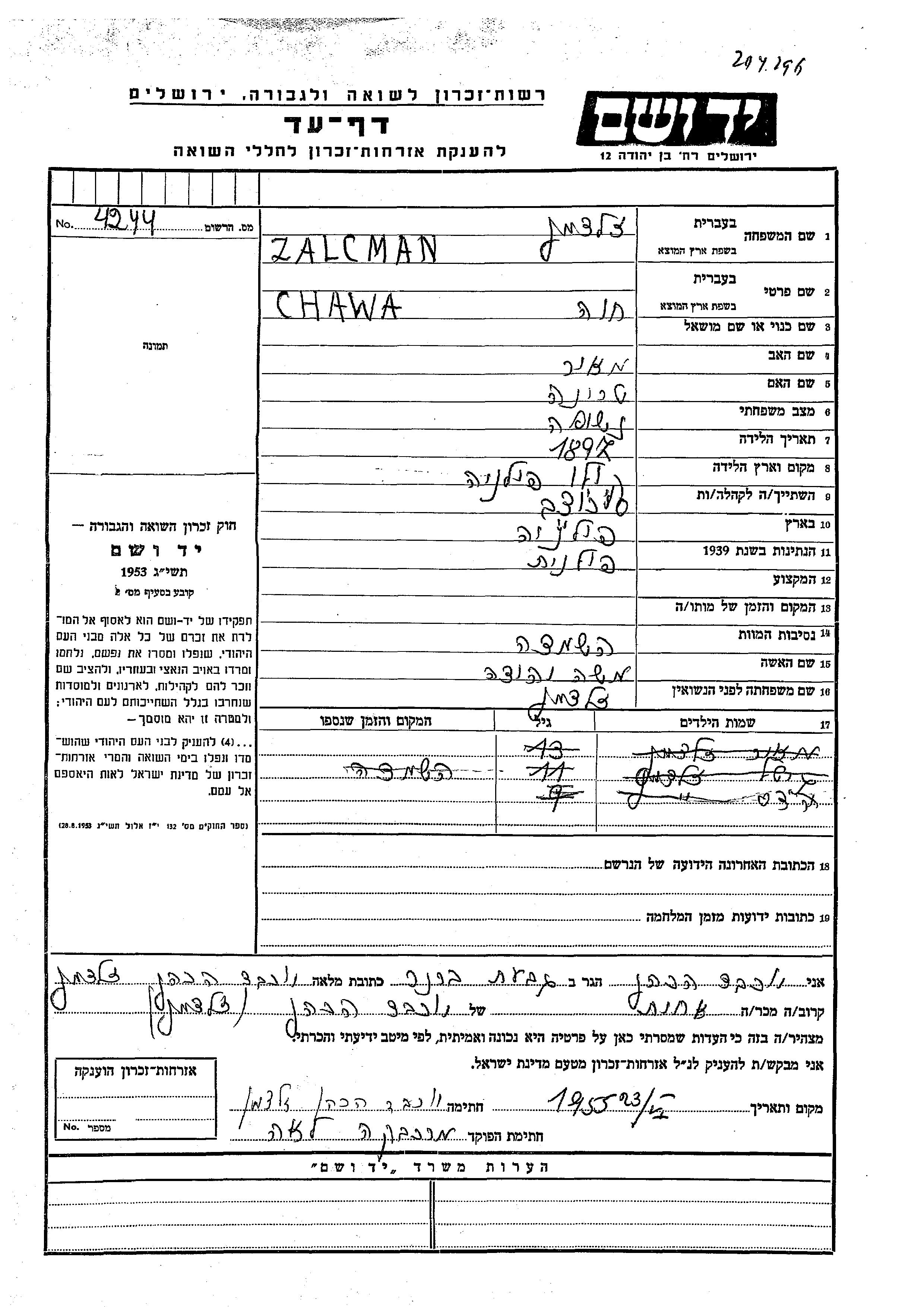 Хава Зальцман, девичья фамилия Зальцман, место рождения: Коло, Польша. Отец: Меир, mать:Трина. Женат / замужем.