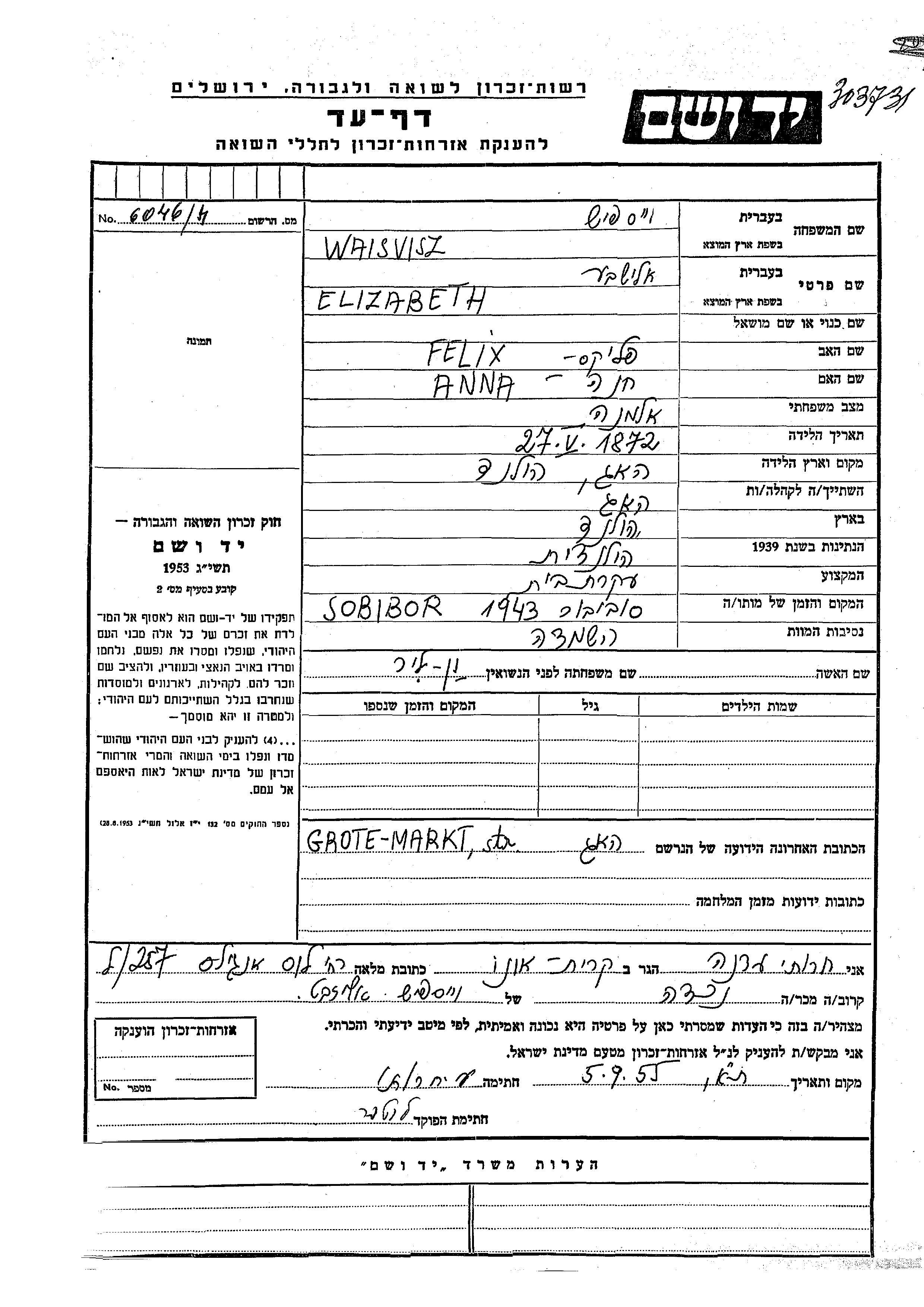 Элизабет Элишева Вайсфиш, место рождения: Гаага, Нидерланды. Отец: Феликс, mать:Анна Хана. Домохозяйка. Место во время войны: Гаага, Германия.
