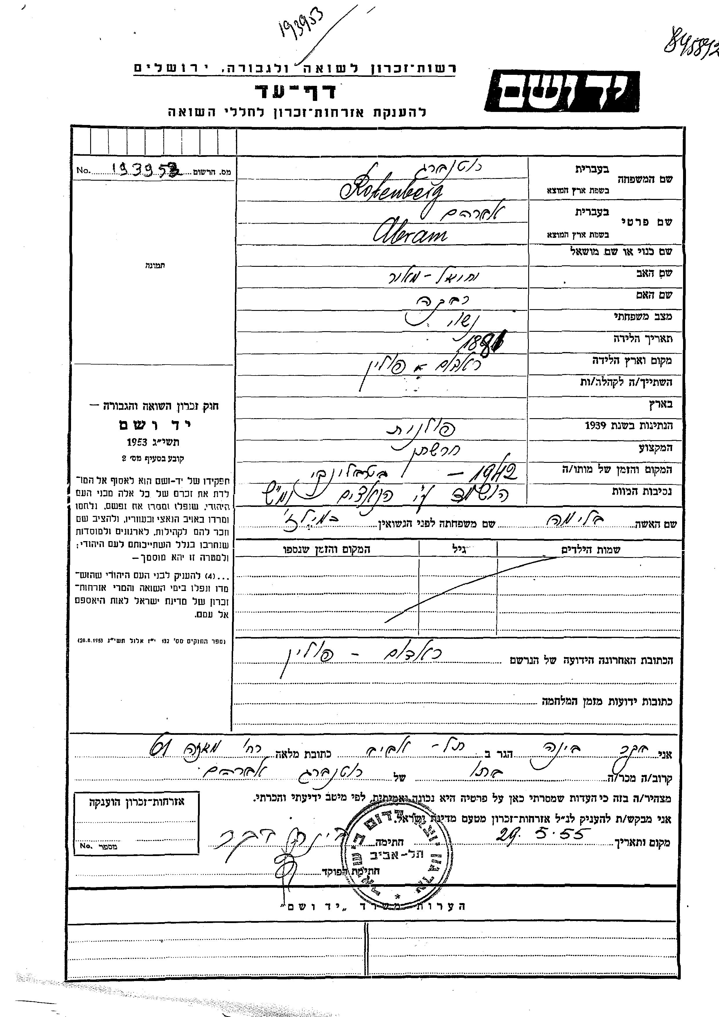 Абрам Ротенберг, место рождения: Радом, Польша. Отец: Иехиэль Меир, mать:Ривка. Фабрикант. Женат / замужем.
