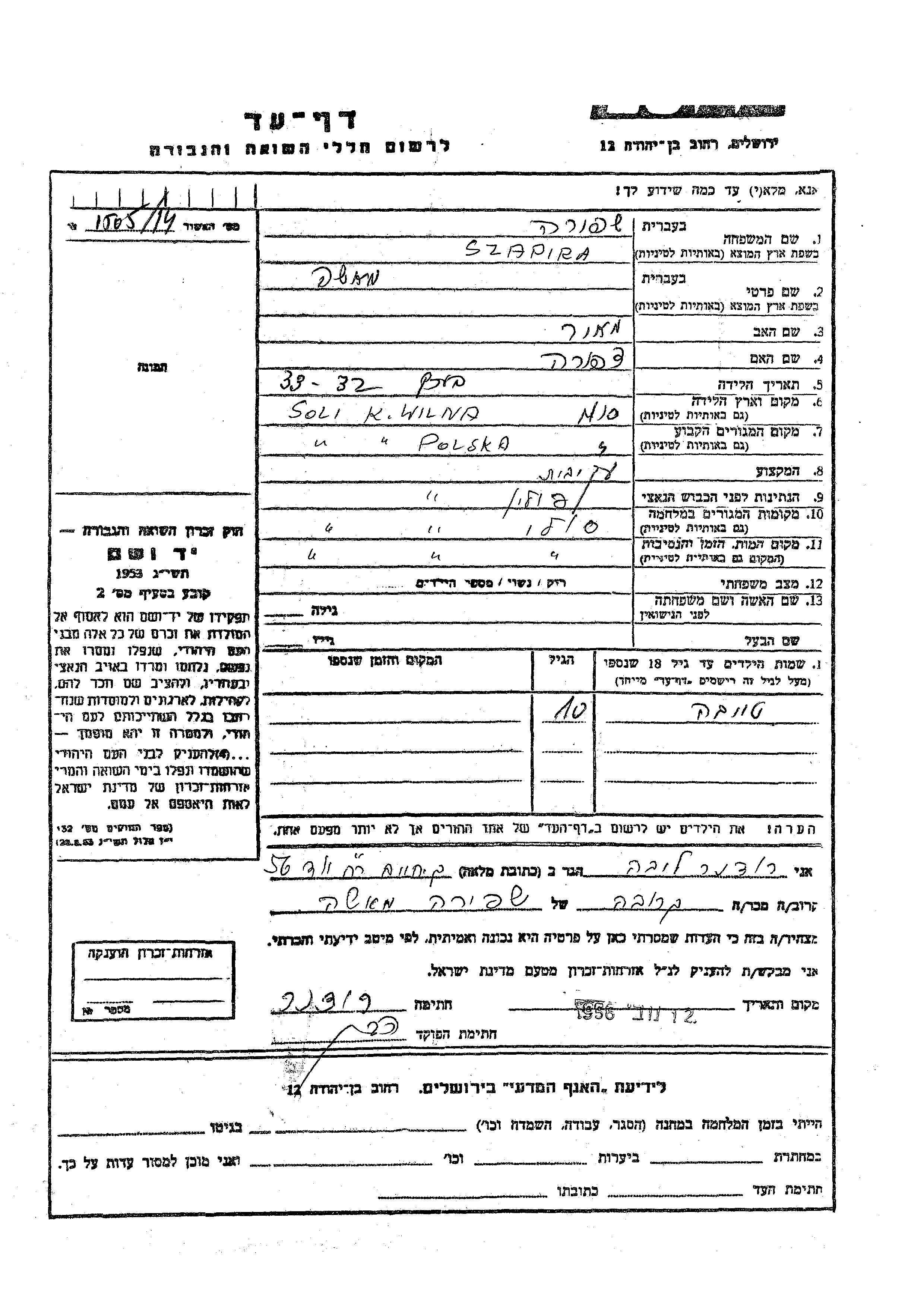 Маша Шапира, место рождения: Солы, Польша. Отец: Меир, mать:Ципора. Домохозяйка. Женат / замужем. Место жительства до войны: Солы, Польша. Место во время войны: Солы, Польша.