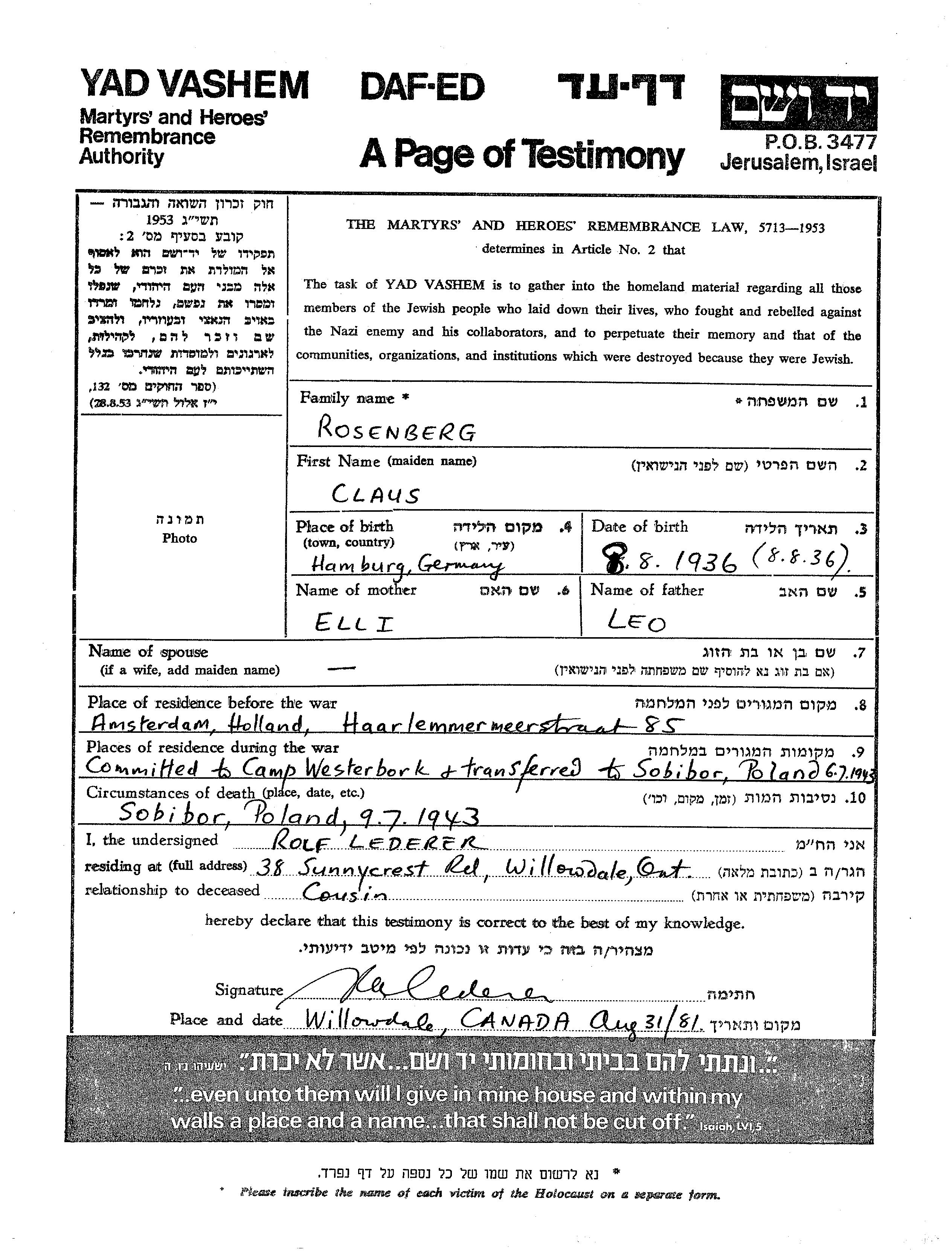 Клаус Розенберг, место рождения: Гамбург, Германия. Отец: Лио, mать:Элли. Место жительства до войны: Амстердам, Нидерланды. Место во время войны: Собибур, Польша.