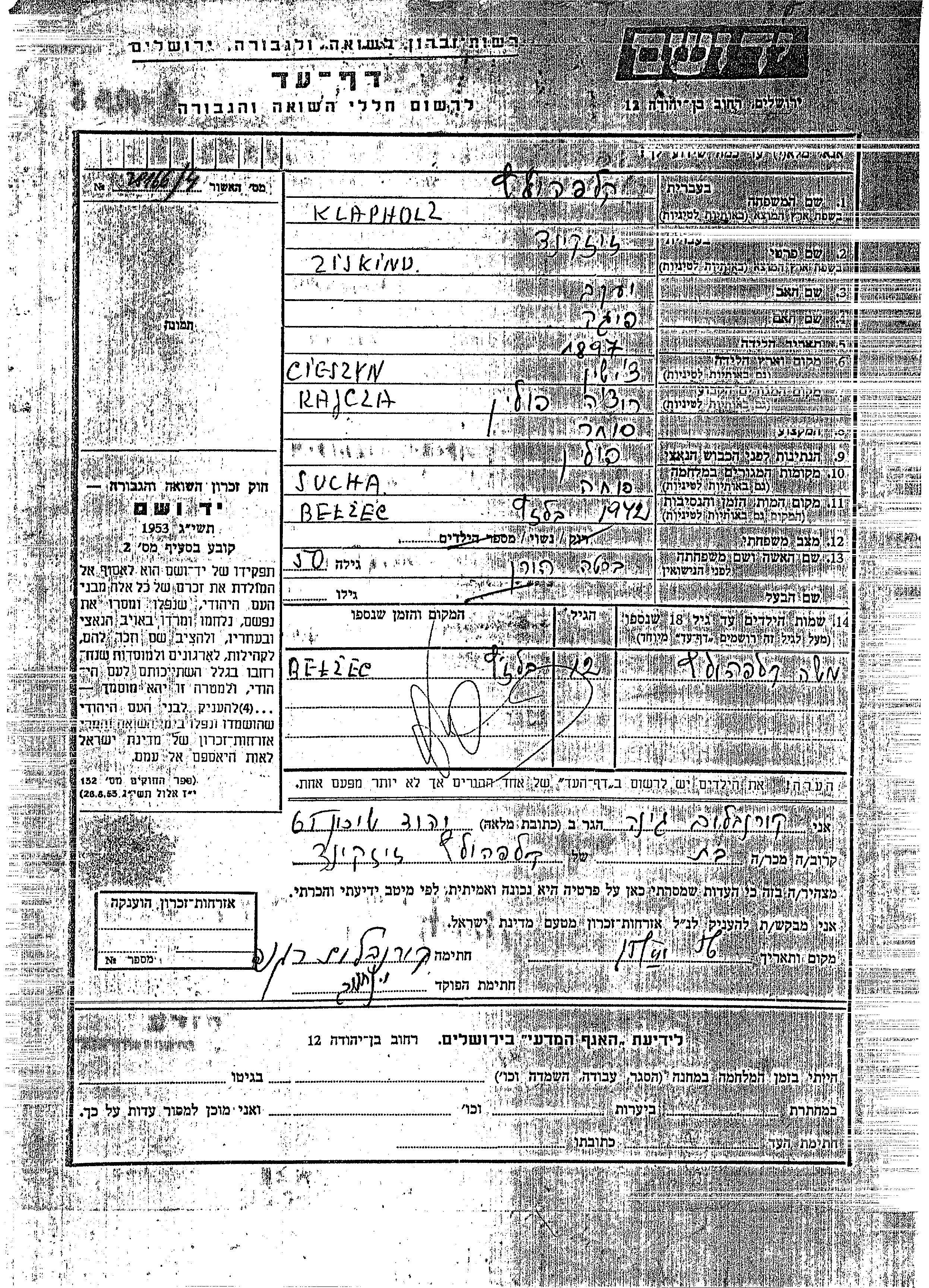 Зизкинд Клапхольц, место рождения: Цешин, Польша. Отец: Яков, mать:Фейга. Торговец / торговка. Женат / замужем. Место жительства до войны: Райча, Польша. Место во время войны: Суха, Польша.