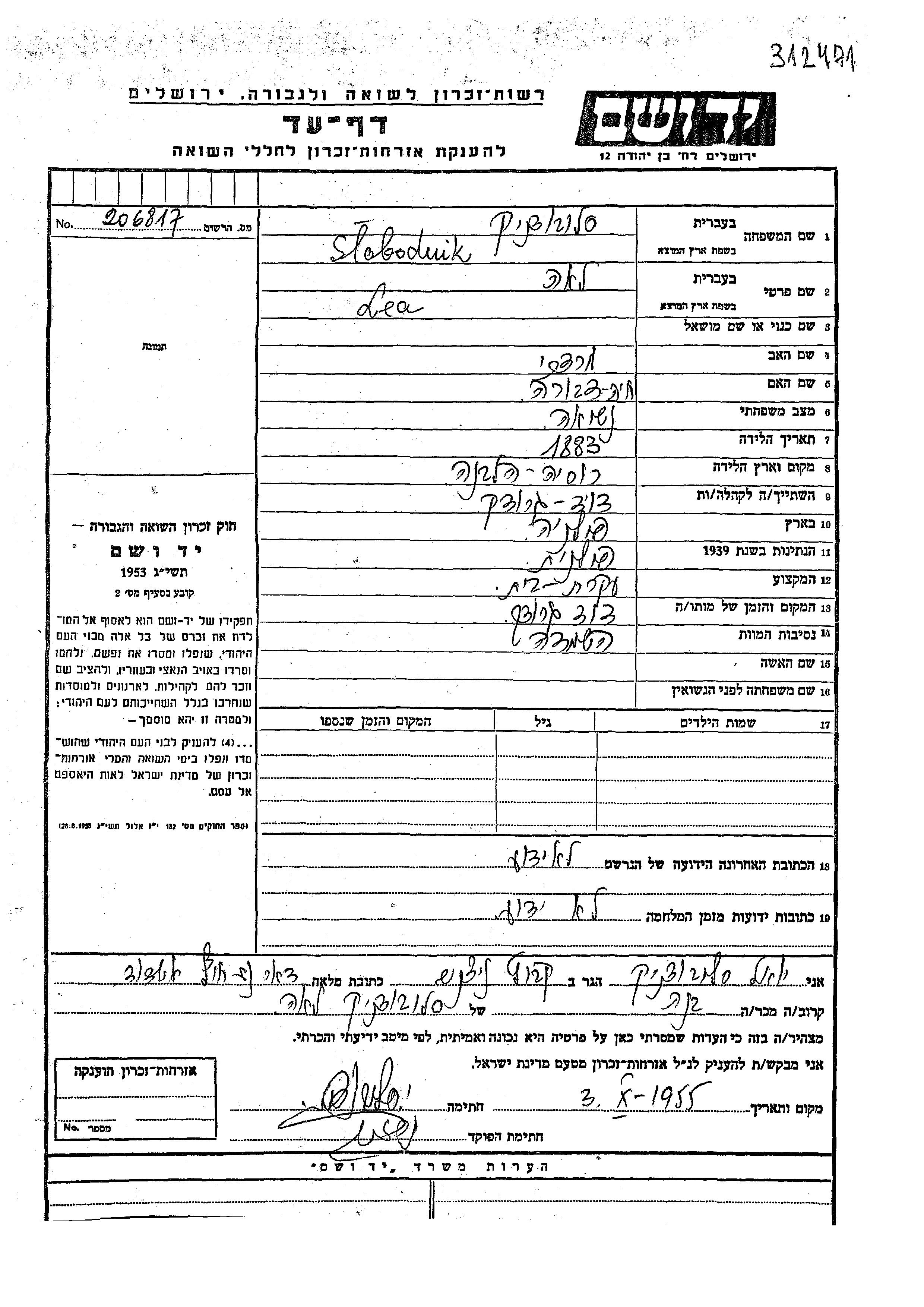 Лея Слободник, место рождения: Россия (СССР). Отец: Мордехай, mать:Хая Двора. Домохозяйка. Женат / замужем. Место жительства до войны: Грудек, Польша.