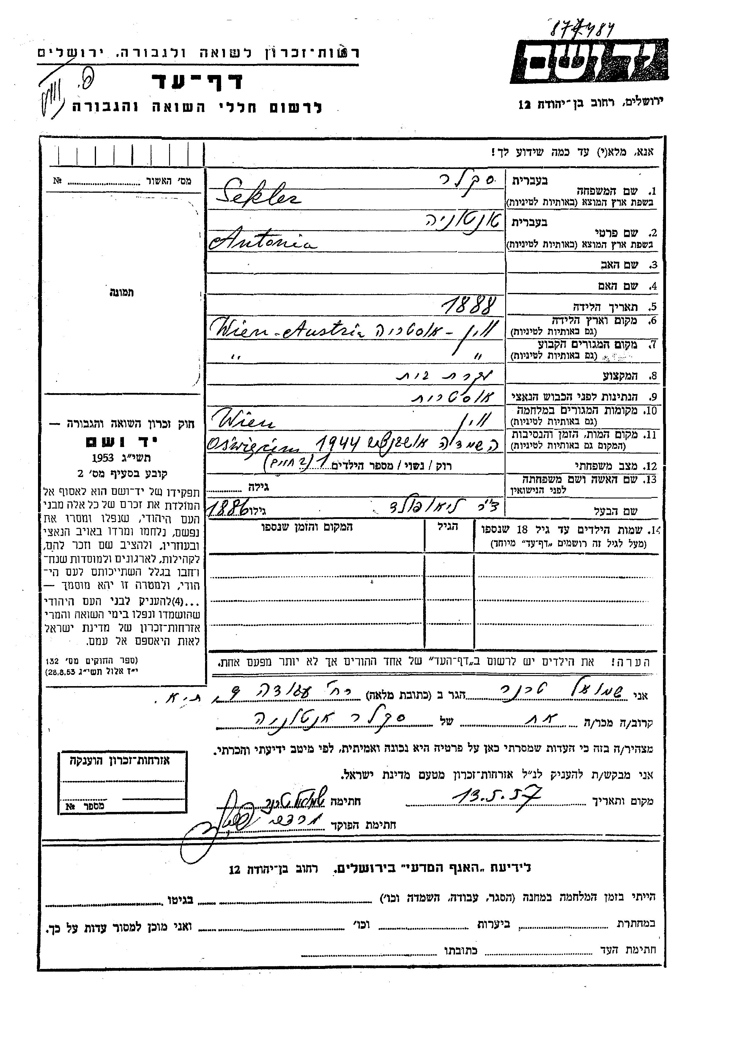 Антония Секлер Скалер, место рождения: Вена, Австрия. Домохозяйка. Женат / замужем. Место жительства до войны: Вена, Австрия. Место во время войны: Вена, Австрия.