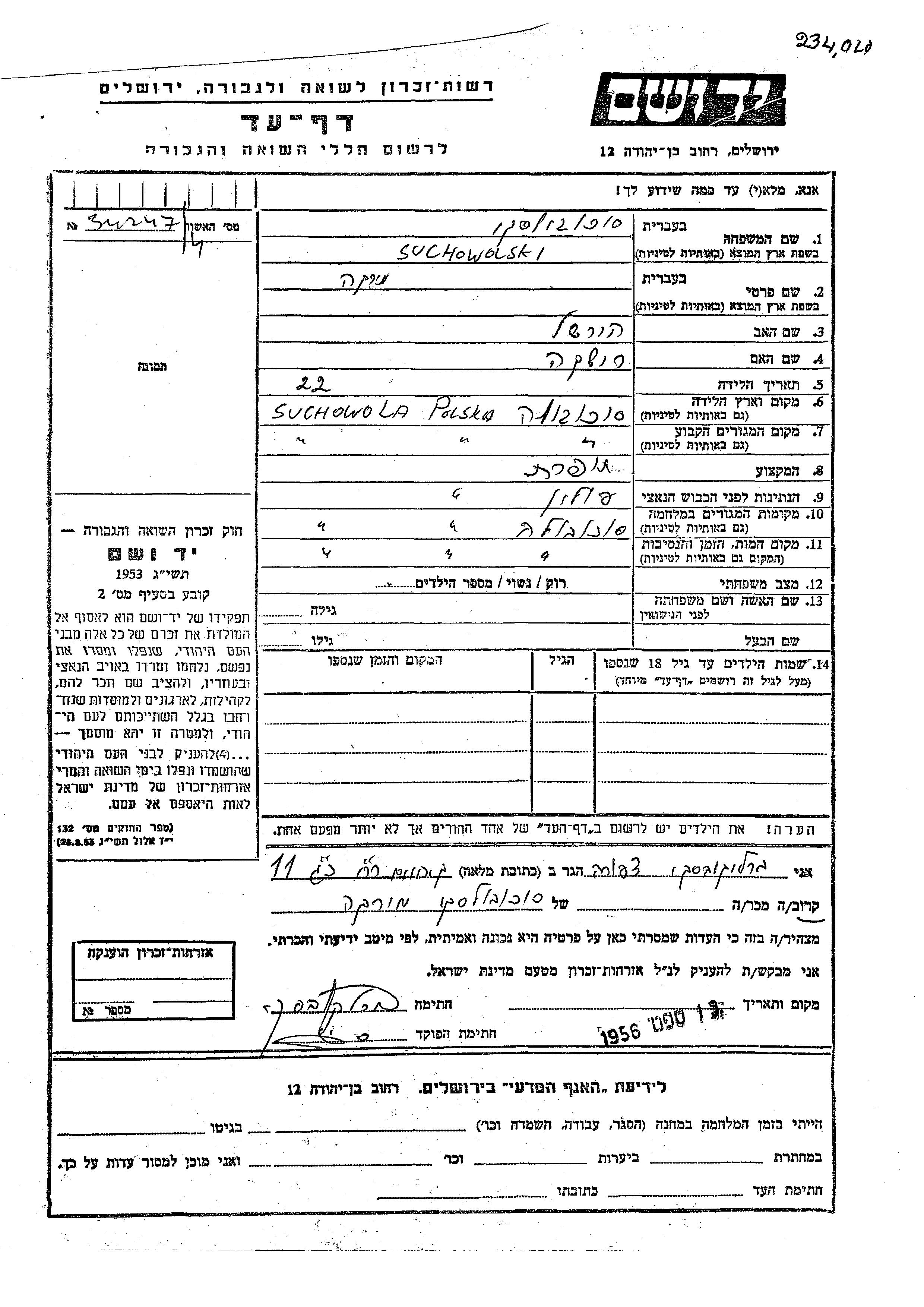 Мирка Суховольски, место рождения: Суховоля, Польша. Отец: Хиршл, mать:Рушка. Швея. Холост / не замужем. Место жительства до войны: Суховоля, Польша. Место во время войны: Суховоля, Польша.