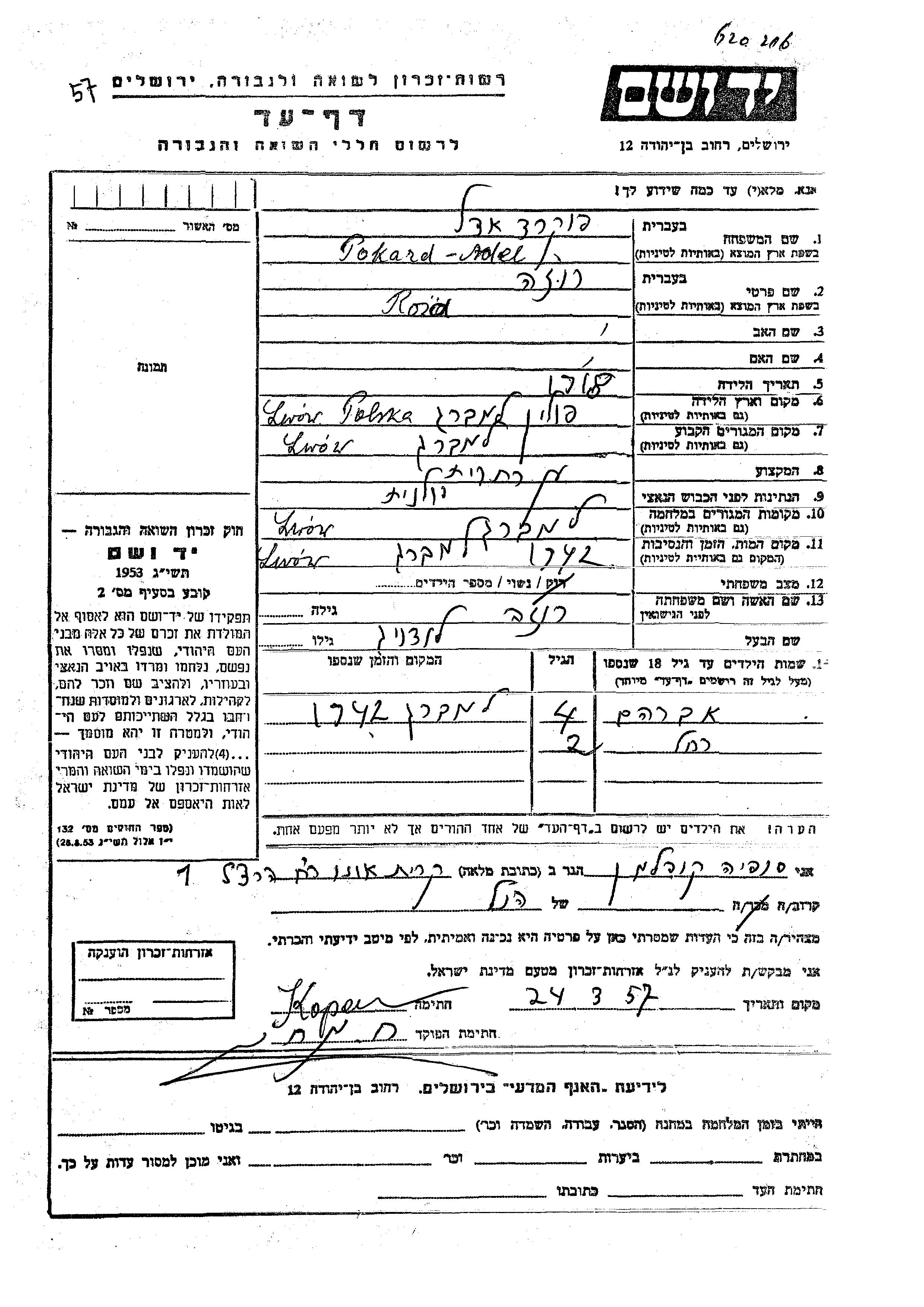 Роза Адель Покард, место рождения: Львов, Польша. Домохозяйка. Женат / замужем. Место жительства до войны: Львов, Польша. Место во время войны: Львов, Польша.