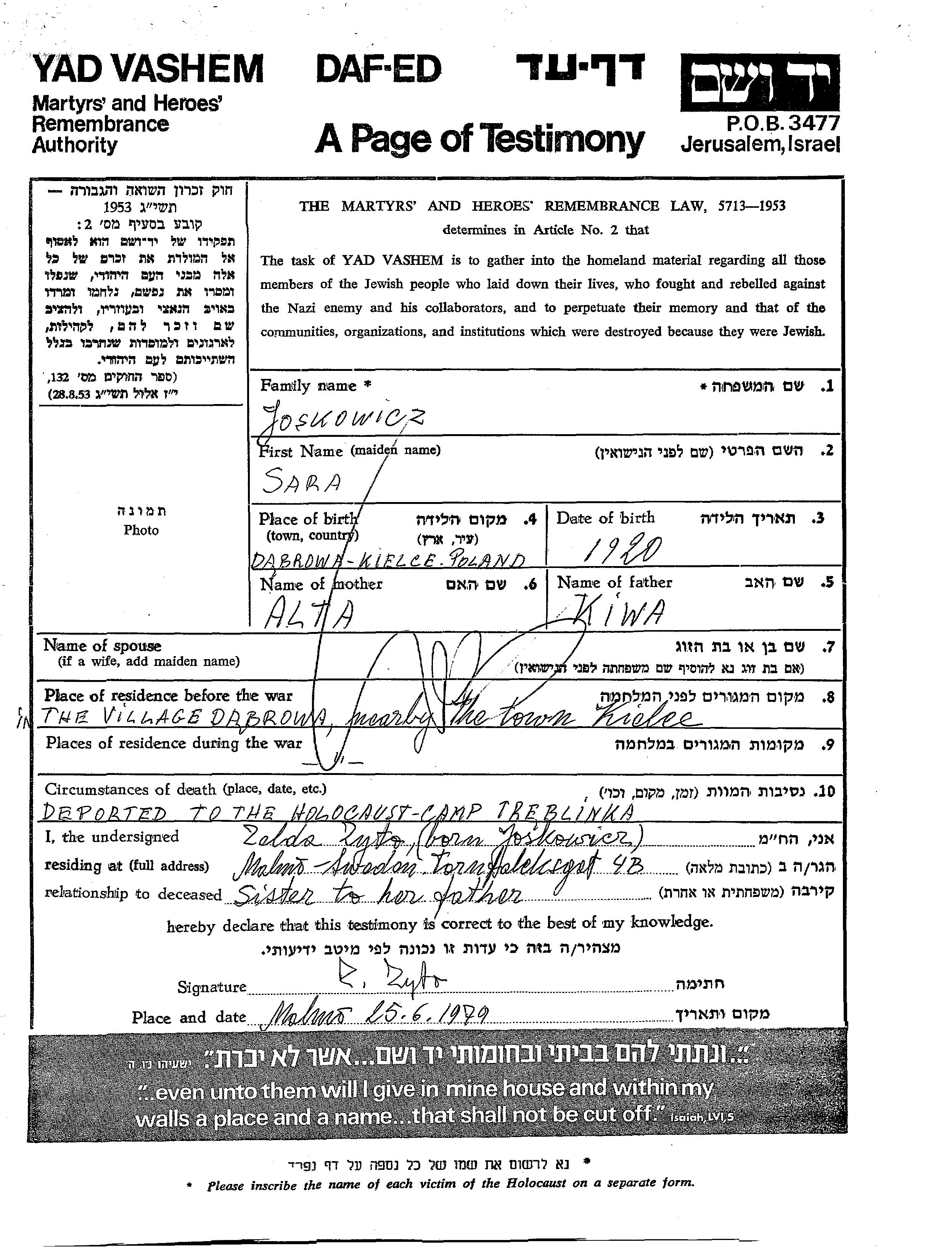 Сара Йоскович, место рождения: Домброва-Гурнича, Польша. Отец: Кива, mать:Алта. Место жительства до войны: Dąbrowa, Польша. Место во время войны: Dąbrowa, Польша.