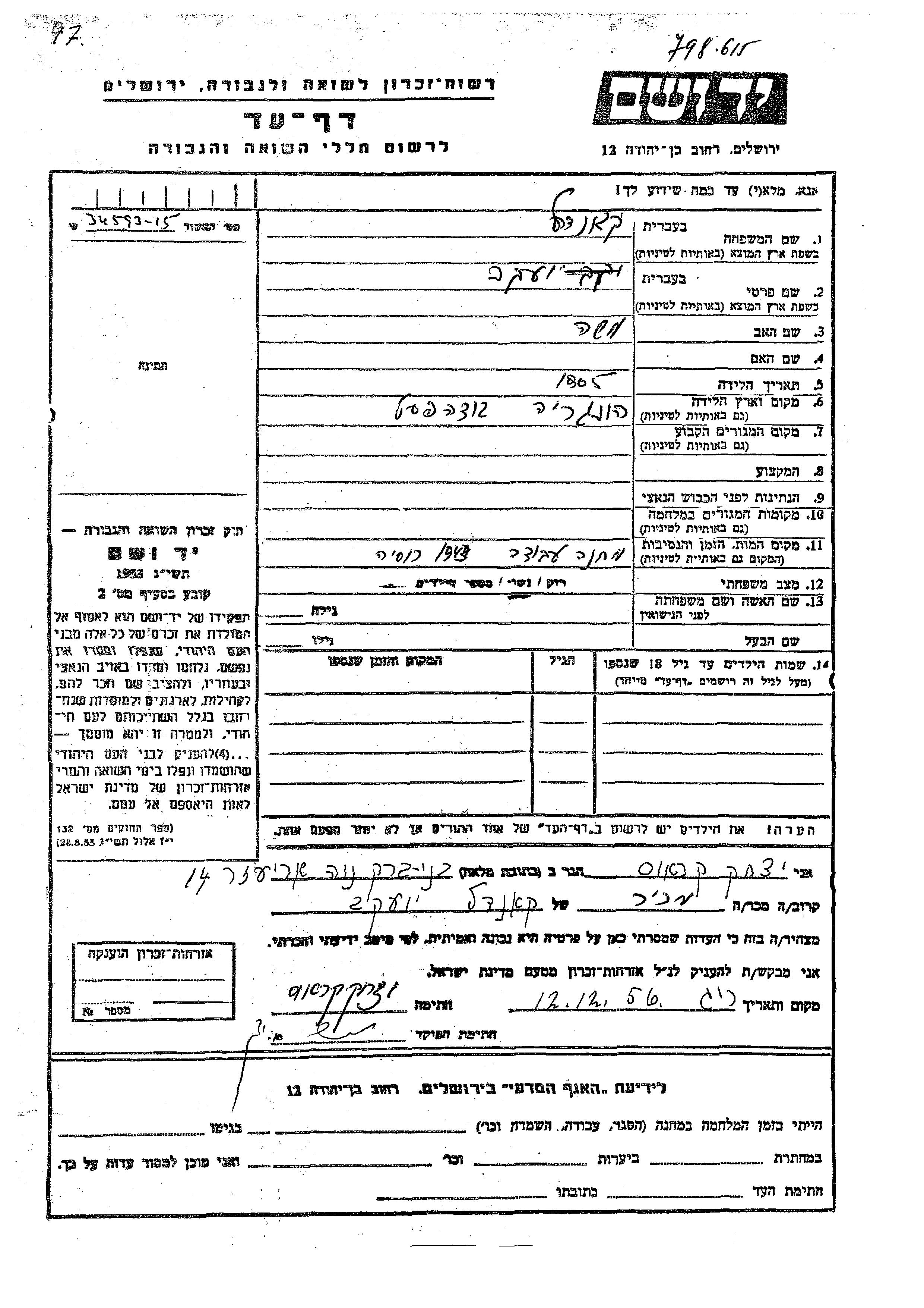 Яд Вашем - Листы свидетельских показаний Мемориального фонда