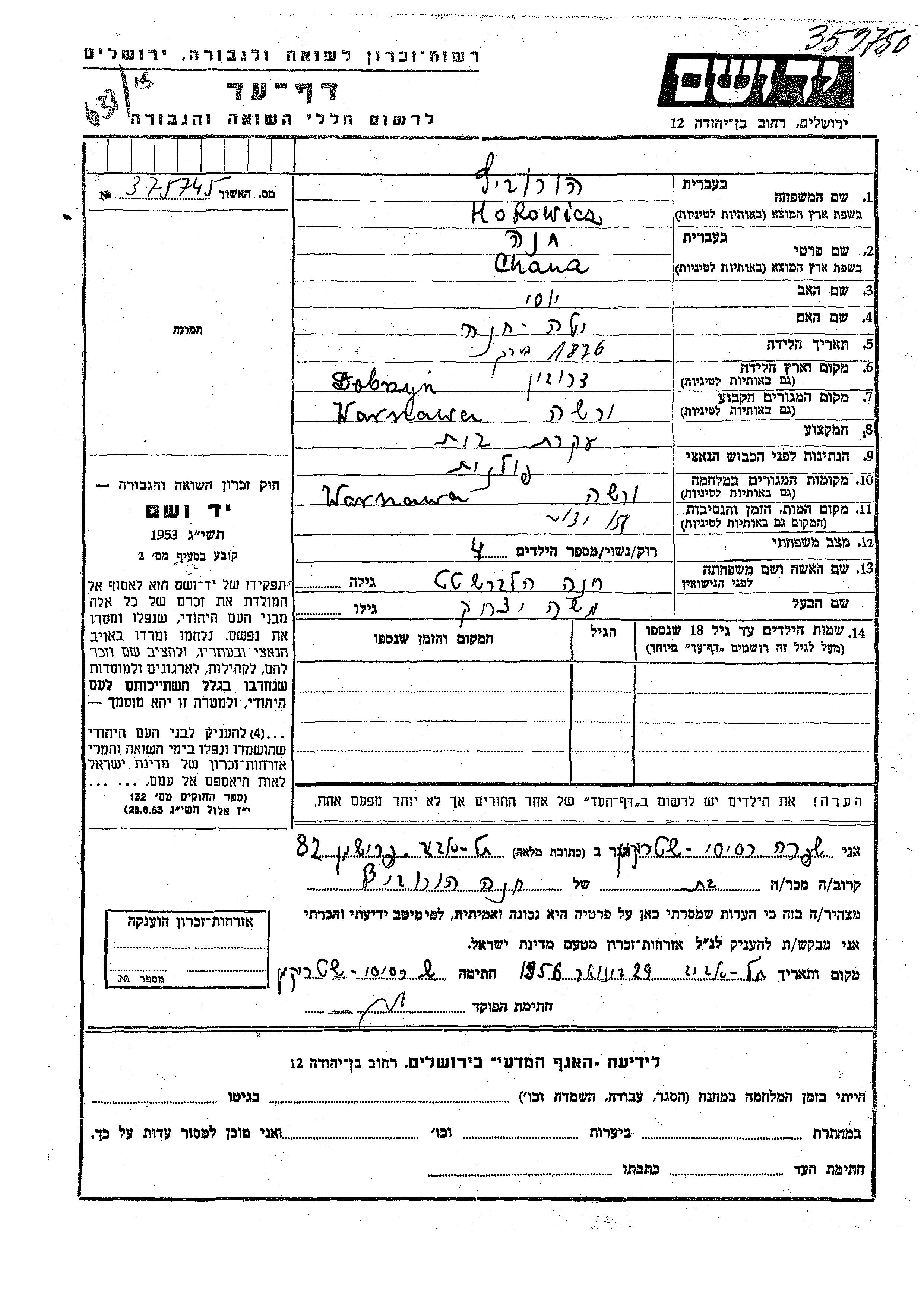 Хорович Хана 1879 Варшава, Польша Лист свидетельских показаний