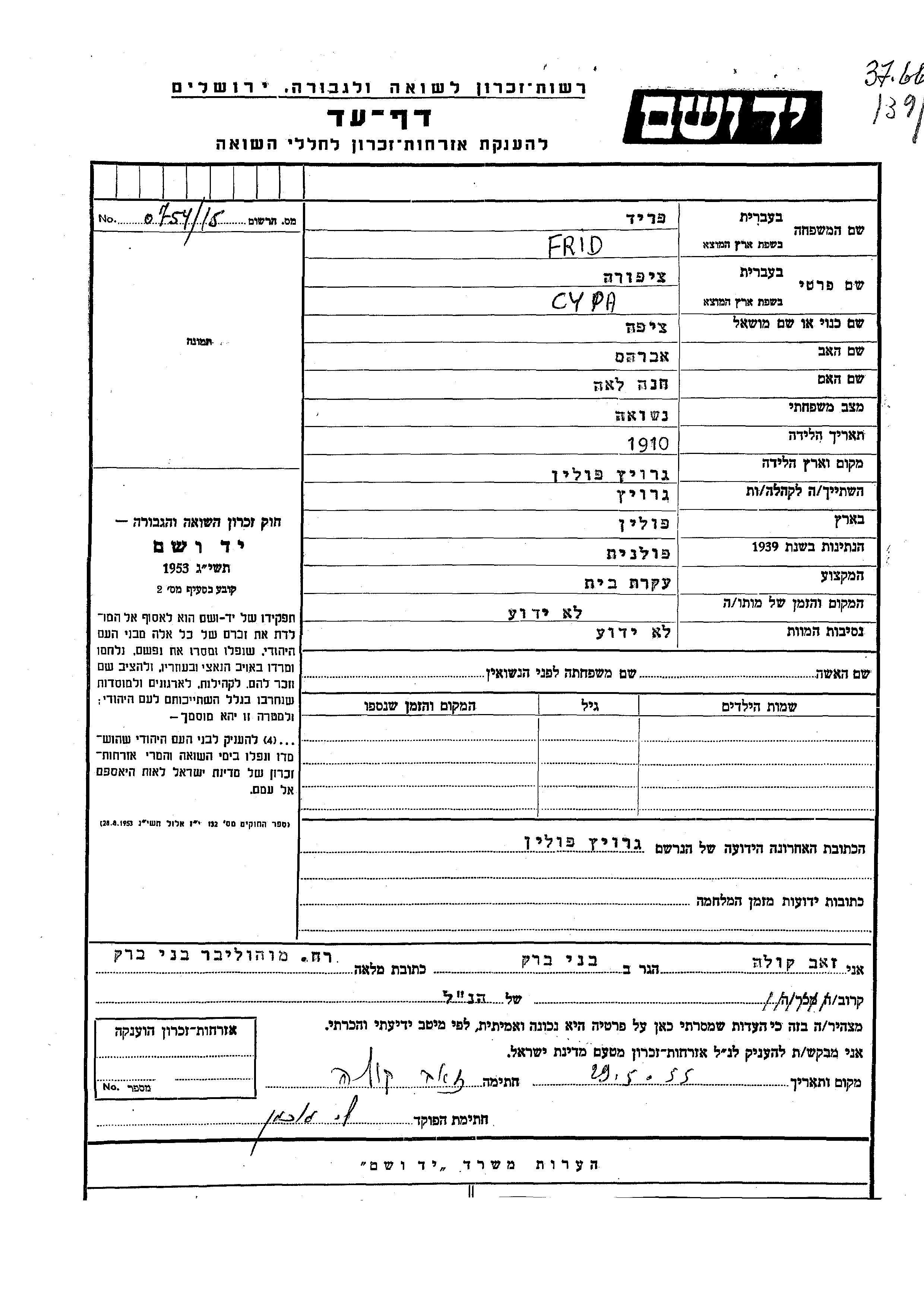 Ципа Фрид, место рождения: Груец, Польша. Отец: Авраам, mать:Хана Лея. Домохозяйка.