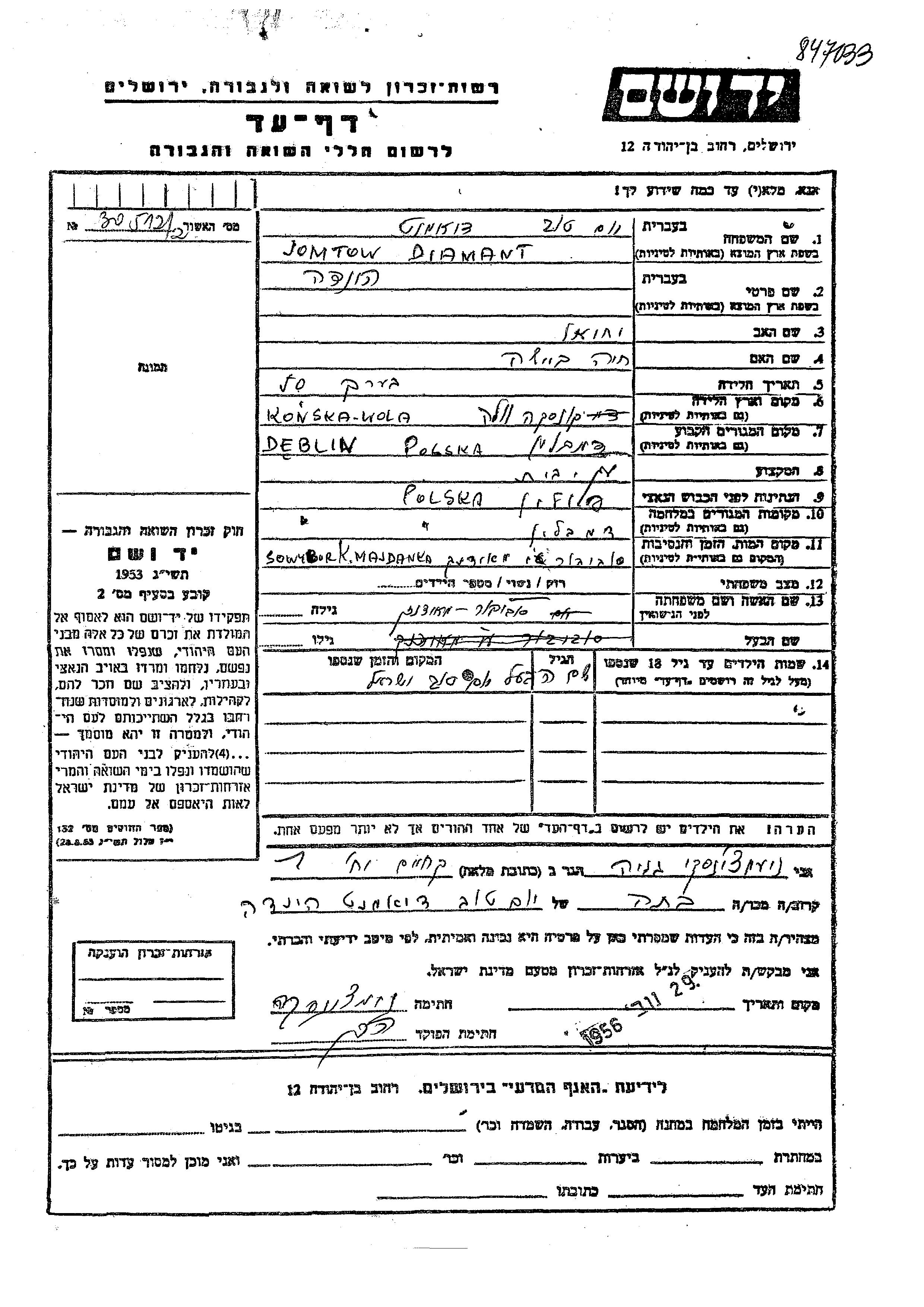 Хинда Йомтов, девичья фамилия Диамант, место рождения: Коньска Воля, Польша. Отец: Иехиэль, mать:Хая Бейла. Домохозяйка. Женат / замужем. Место жительства до войны: Демблин, Польша. Место во время войны: Демблин, Польша.