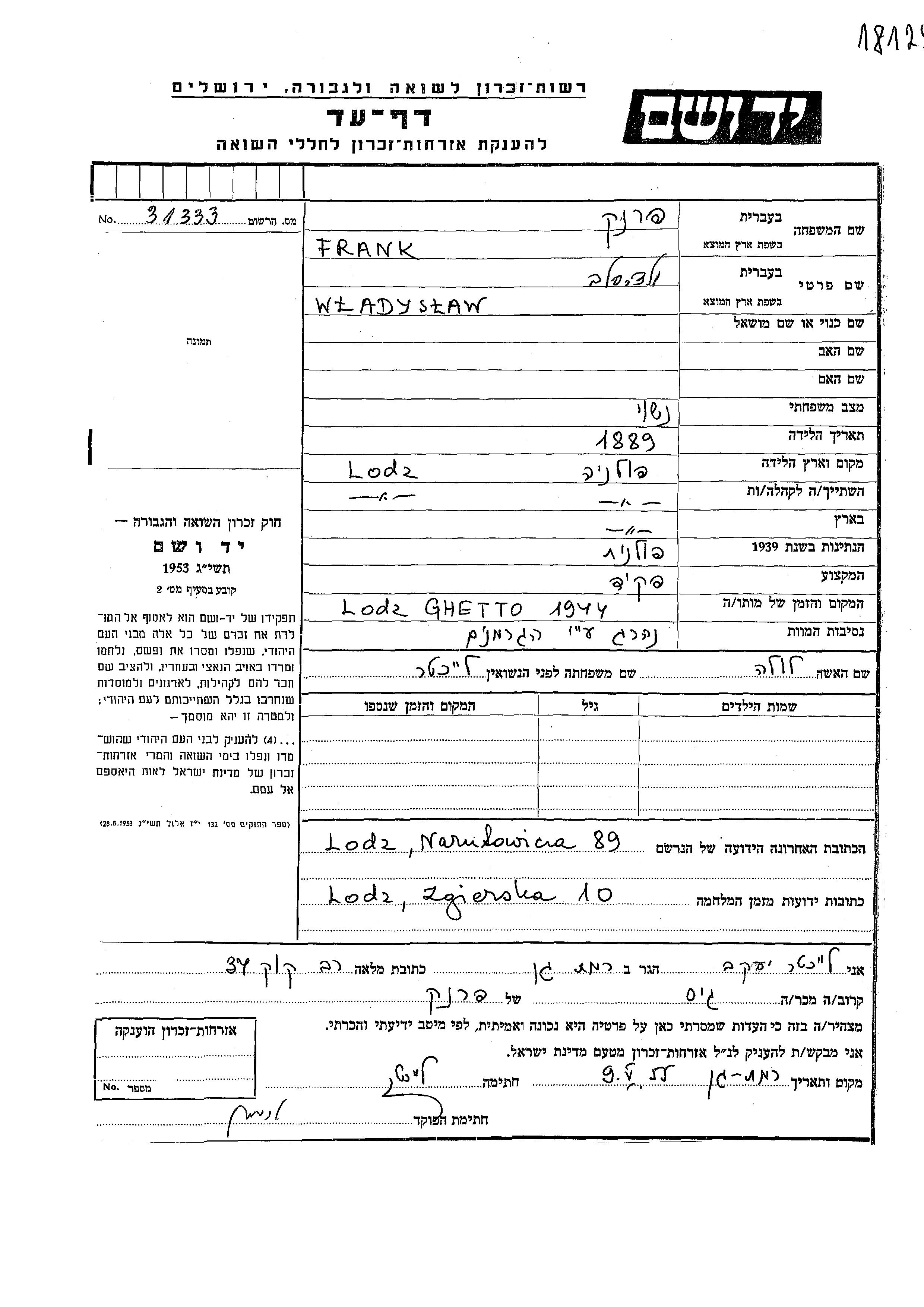 Владислав Франк, место рождения: Лодзь, Польша. Клерк. Женат / замужем. Место жительства до войны: Лодзь, Польша. Место во время войны: Лодзь, Польша.