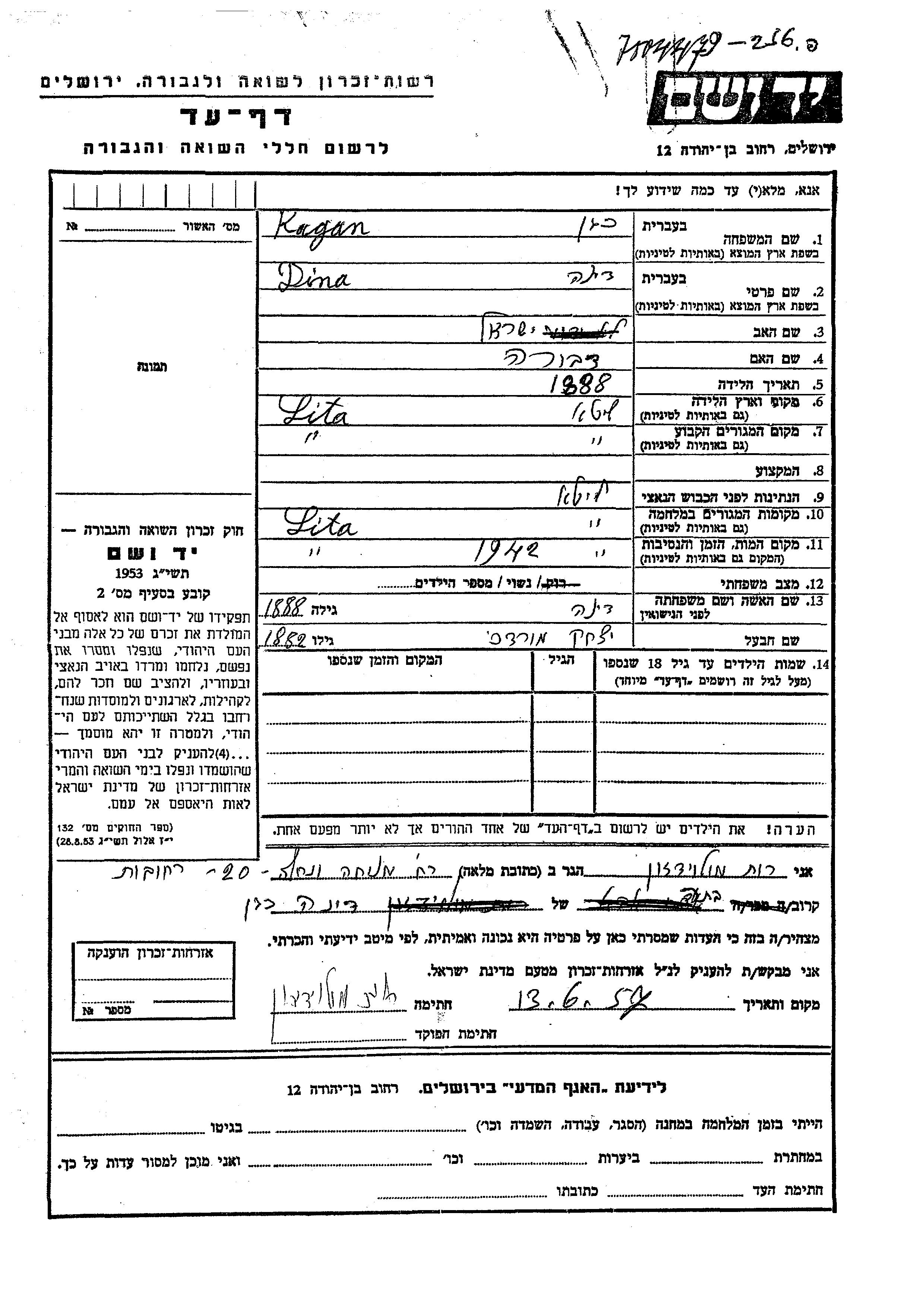 Дина Каган, место рождения: Литва. Отец: Исраэль, mать:Двора. Женат / замужем. Место жительства до войны: Литва. Место во время войны: Литва.