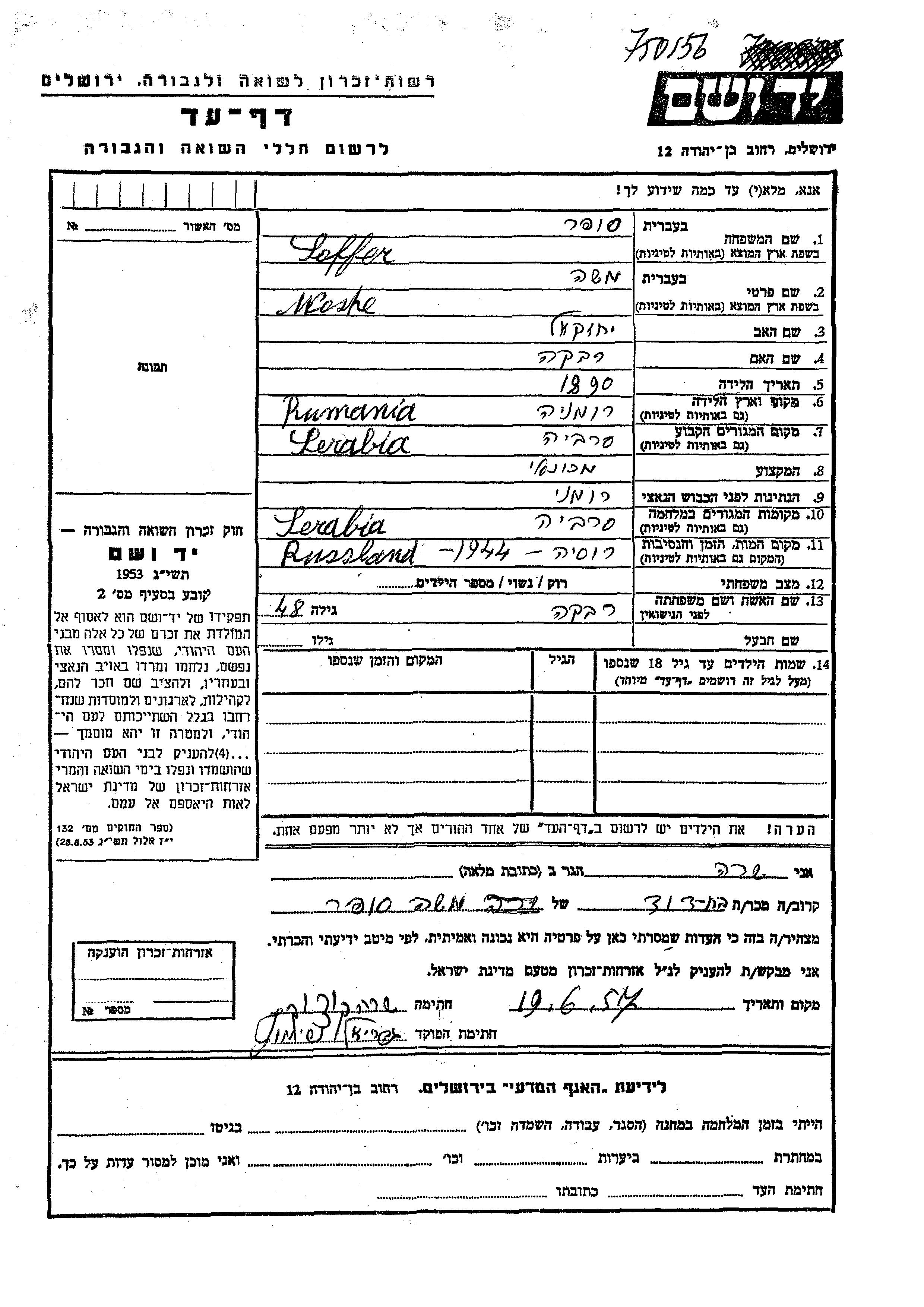 Моше Соффер, место рождения: Румыния. Отец: Иехезкель, mать:Ривка. Механик. Женат / замужем. Место жительства до войны: Бессарабия, Румыния. Место во время войны: Бессарабия, Румыния.