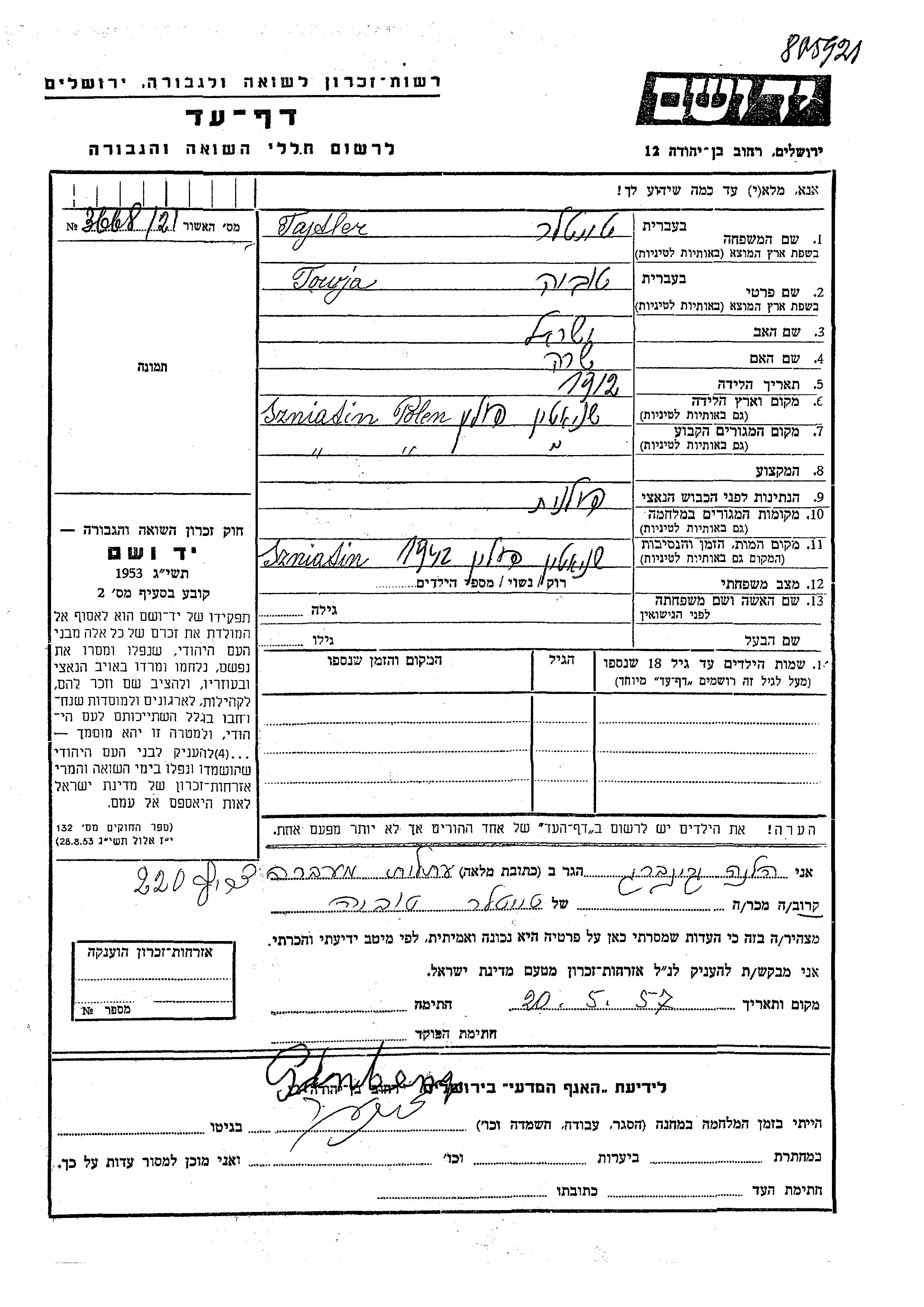 Яд Вашем - Листы свидетельских показаний Мемориального фонда