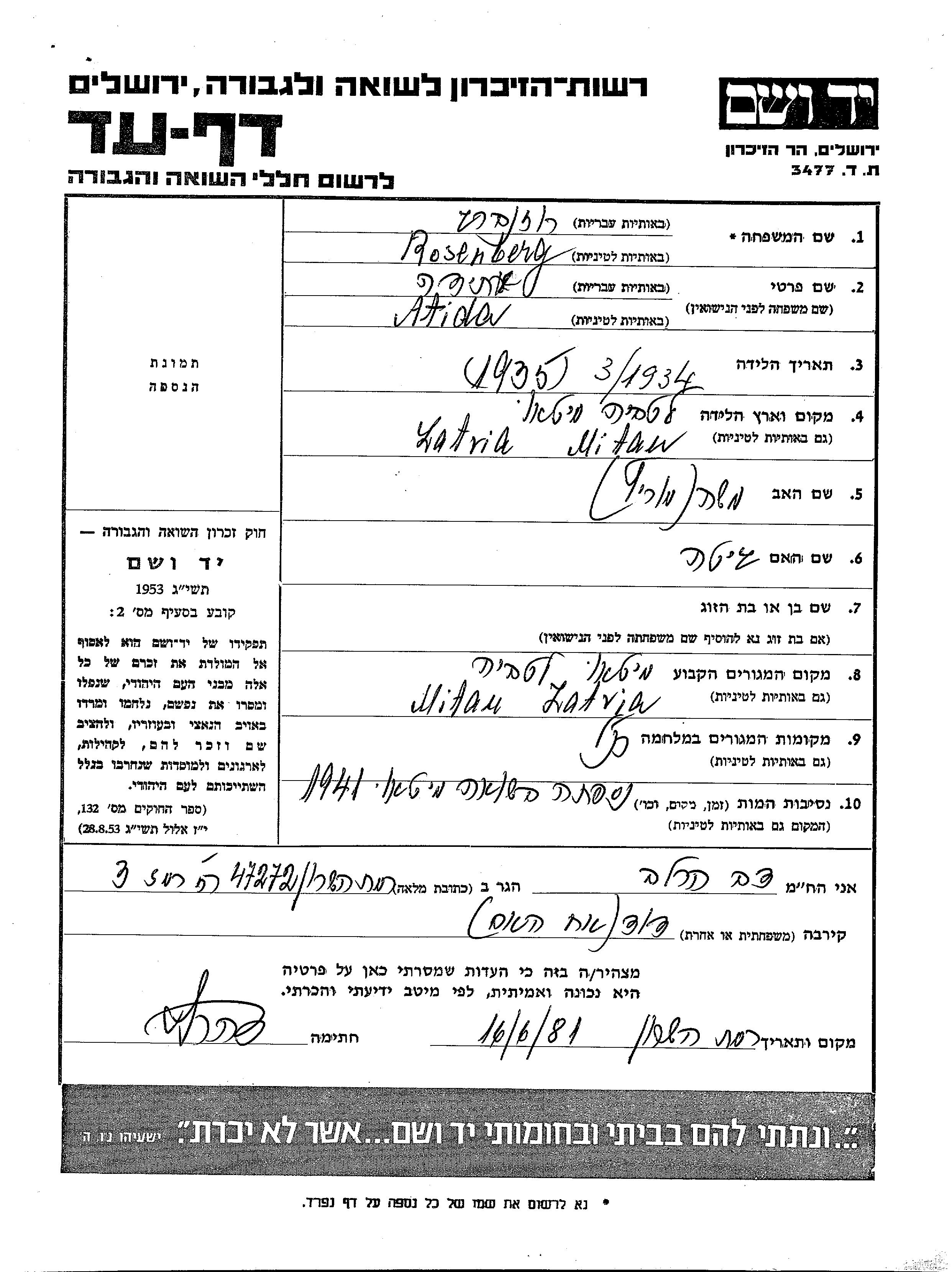 Атида Розенберг, место рождения: Митава, Латвия. Отец: Моше Мориц, mать:Гита. Холост / не замужем. Место жительства до войны: Митава, Латвия. Место во время войны: Митава, Латвия.