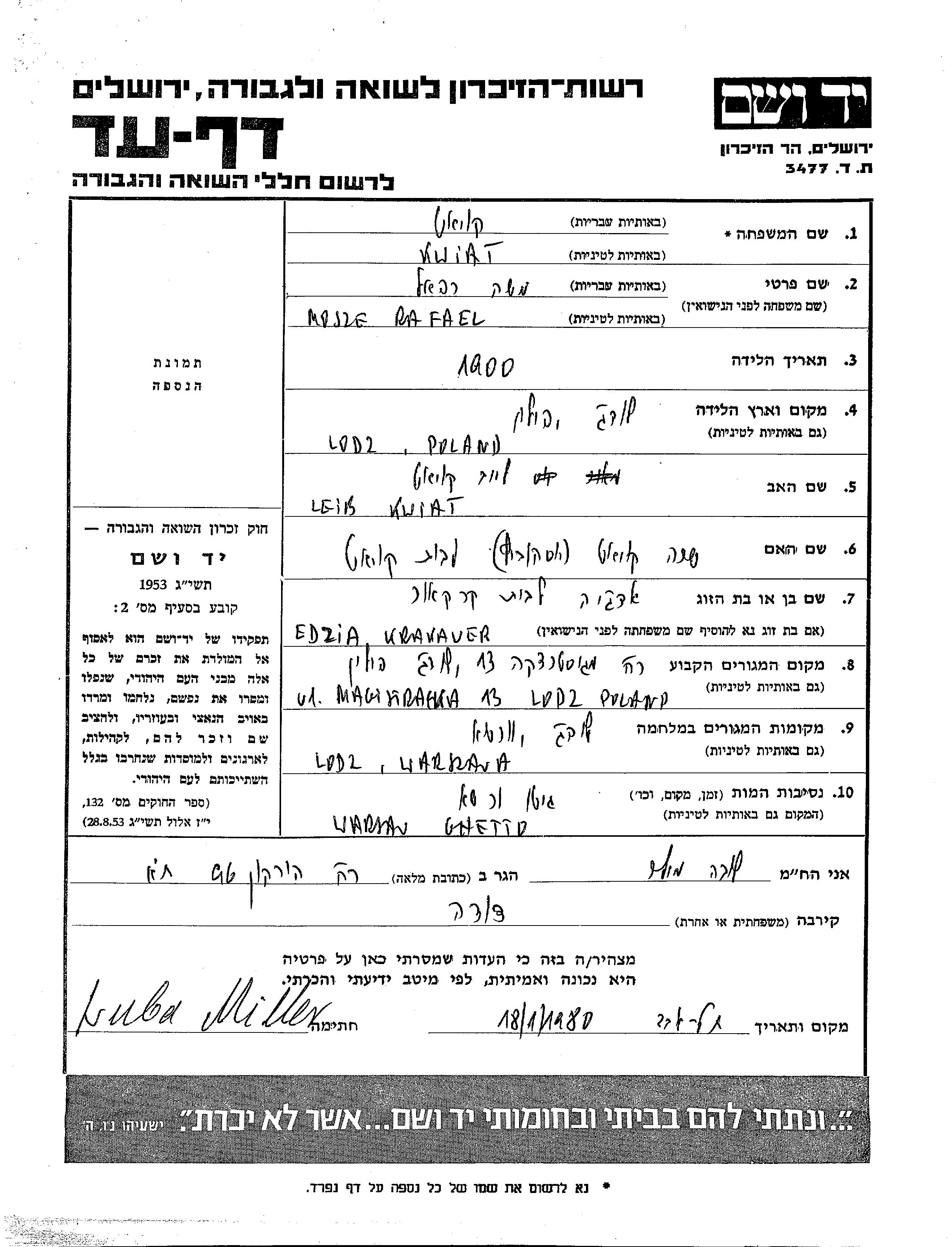Моше Рафаэль Квят, место рождения: Лодзь, Польша. Отец: Лейб, mать:Сара. Место жительства до войны: Лодзь, Польша. Место во время войны: Варшава, Польша.