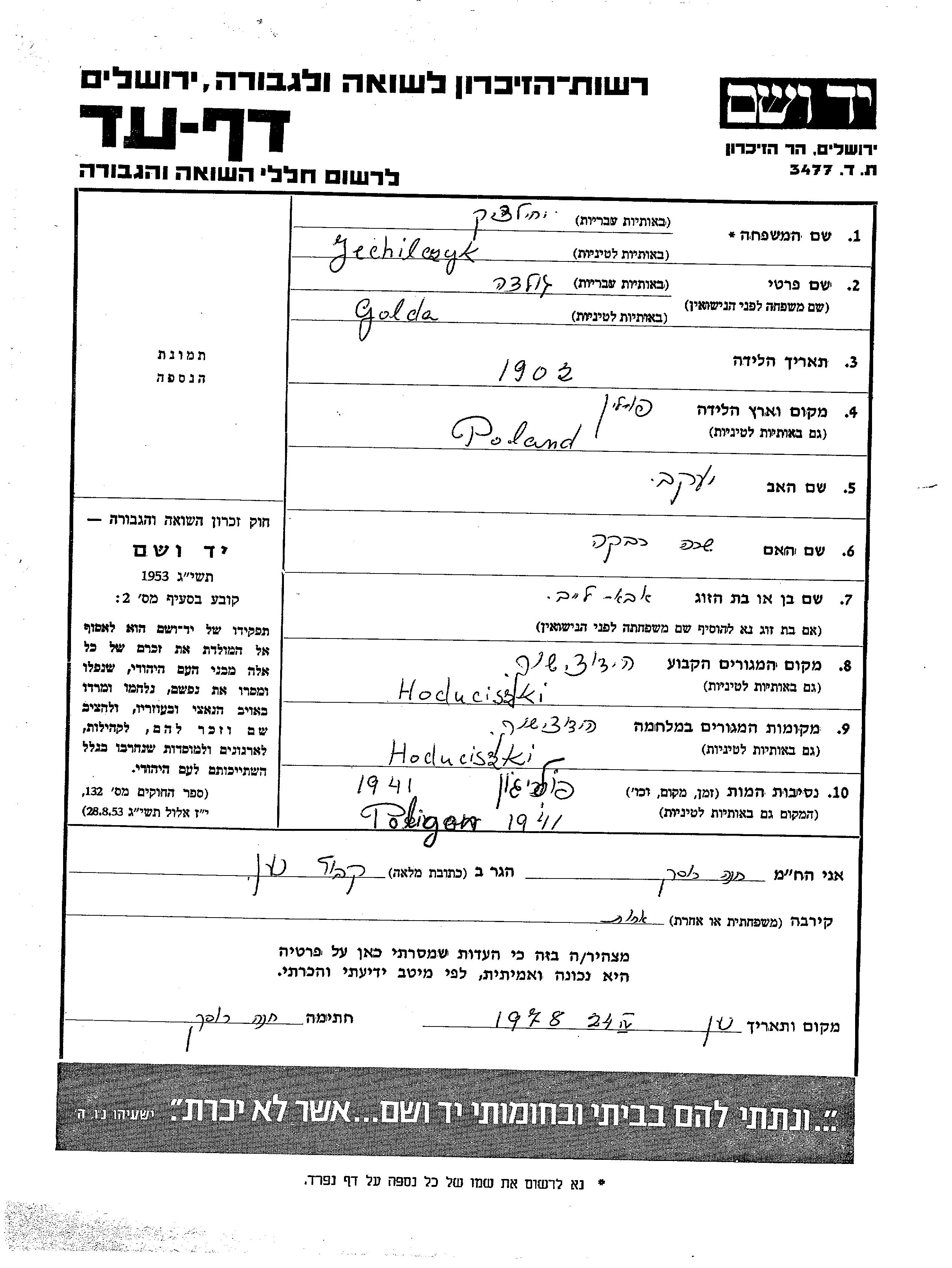 Голда Ехильчик, место рождения: Польша. Отец: Яков, mать:Сара Ривка. Женат / замужем. Место жительства до войны: Ходуцишки, Польша. Место во время войны: Ходуцишки, Польша.