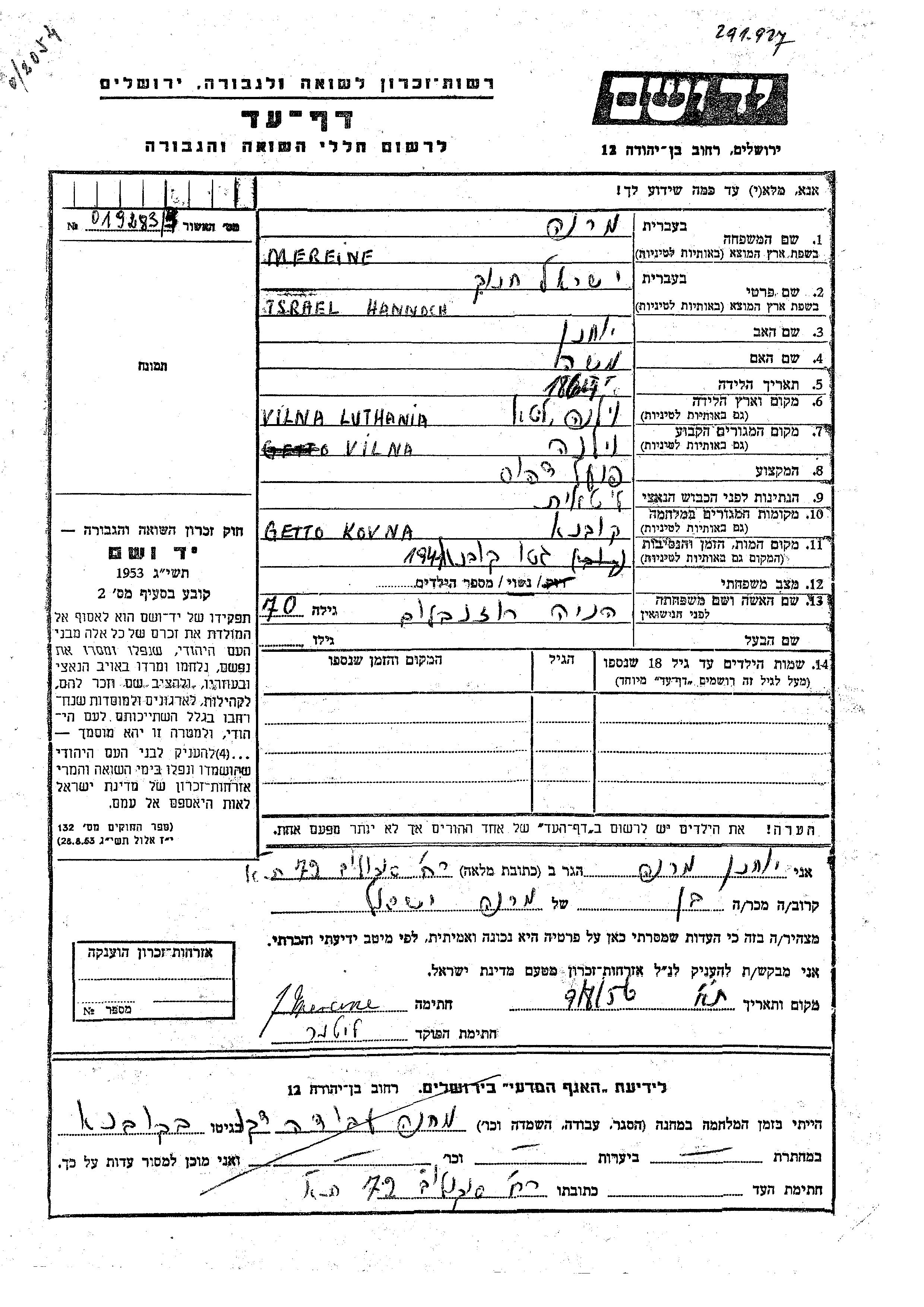 Исраэль Ханох Марена, место рождения: Вильна, Польша. Отец: Иоханан, mать:Моше. Работник типографии. Женат / замужем. Место жительства до войны: Вильна, Польша. Место во время войны: Ковна, Литва.