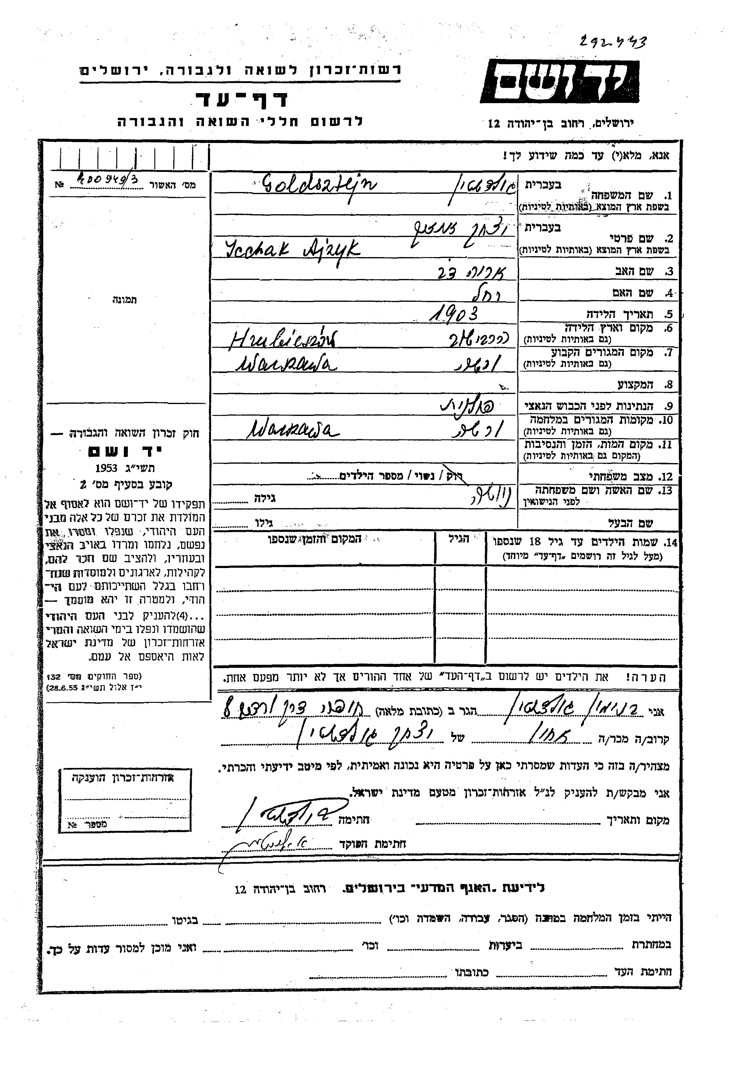Ицхак Гольдштейн, место рождения: Рабуше, Польша. Отец: Арье Дов, mать:Рахель. Женат / замужем. Место жительства до войны: Варшава, Польша. Место во время войны: Варшава, Польша.