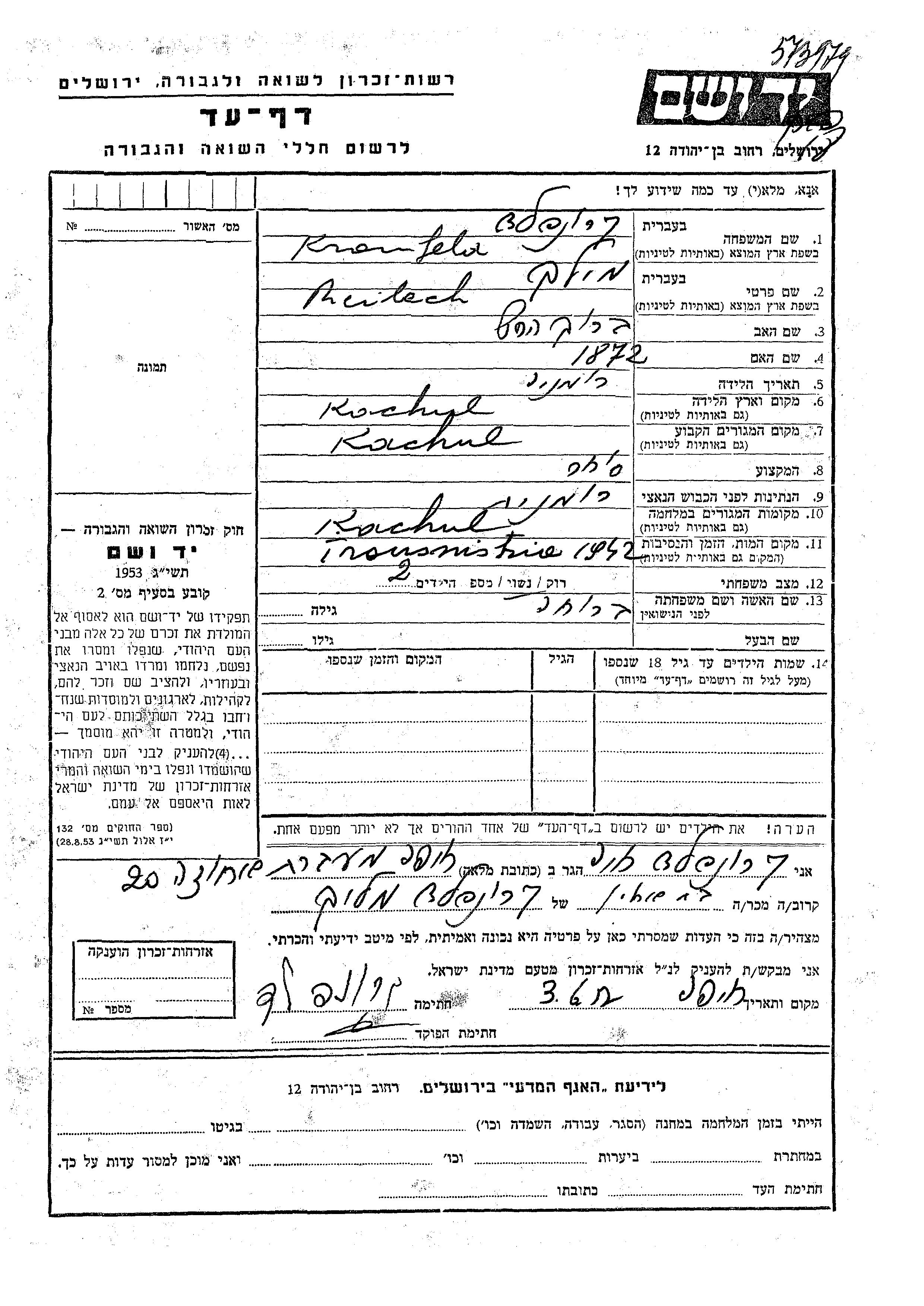 Мелех Кронфельд, место рождения: Кахул, Румыния. Отец: Барух Герш. Торговец / торговка. Женат / замужем. Место жительства до войны: Кахул, Румыния. Место во время войны: Кахул, Румыния.