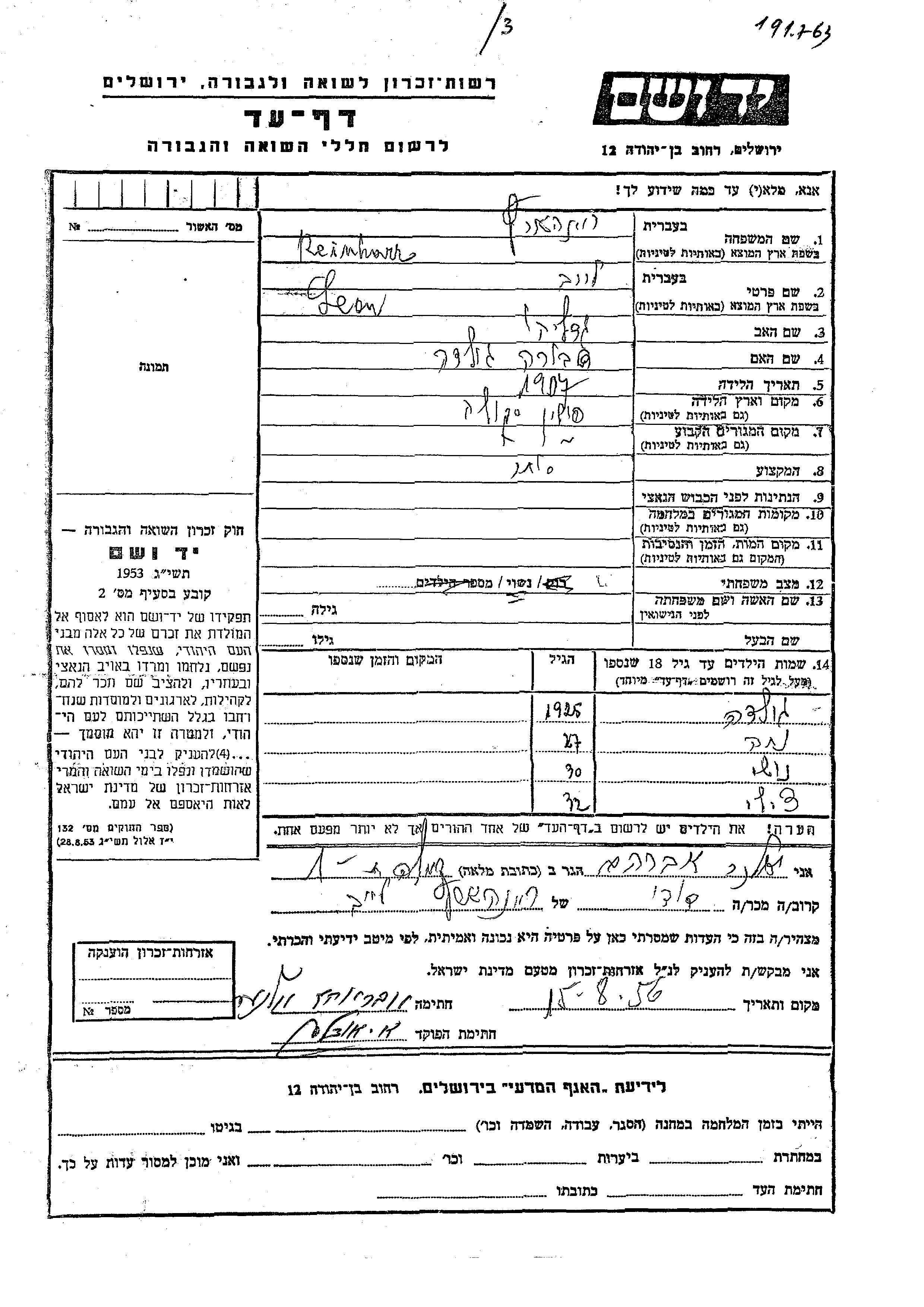 Рейнхарц Леон Лейб 1907 Сколе, Польша Лист свидетельских показаний