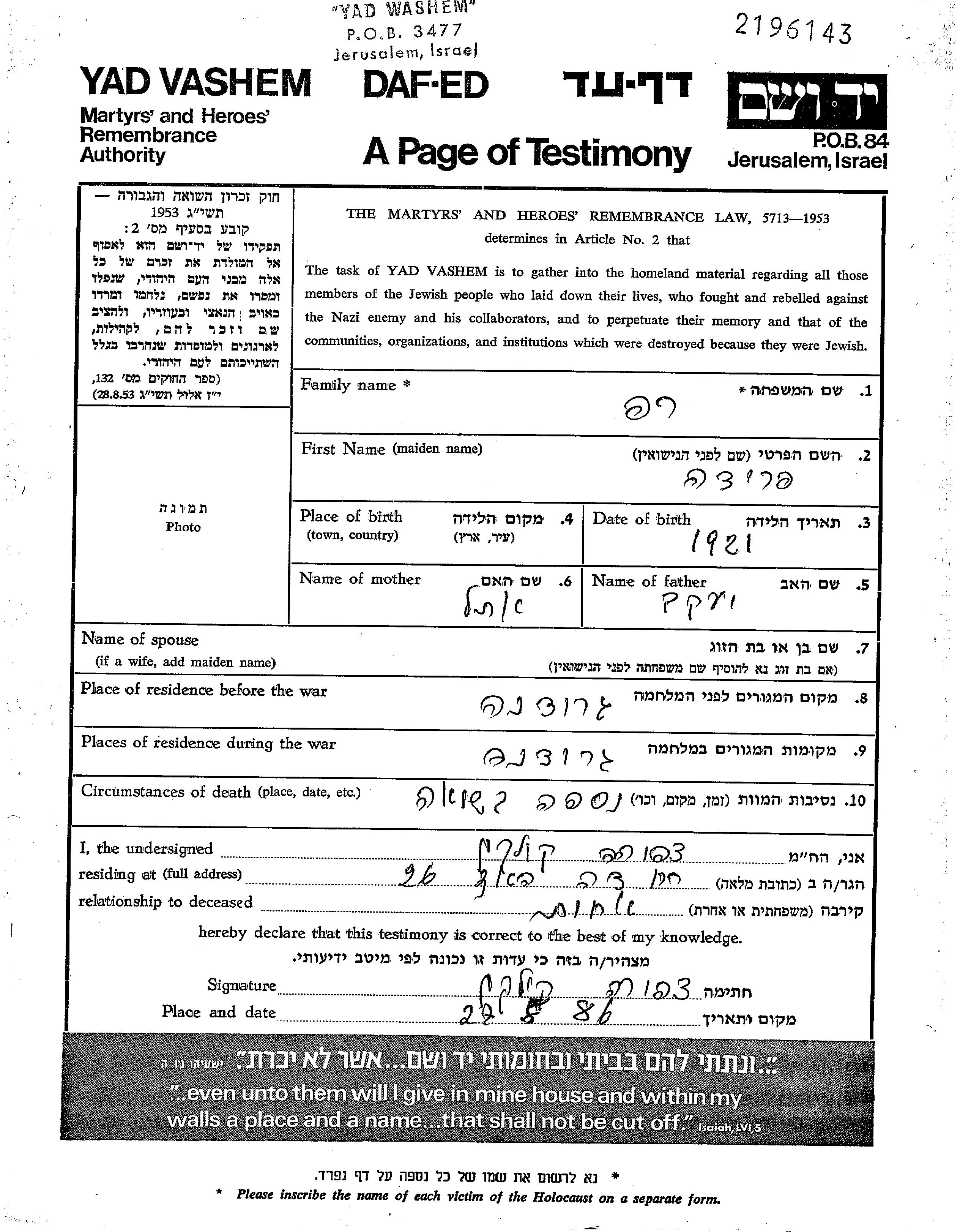 Яд Вашем - Листы свидетельских показаний Мемориального фонда