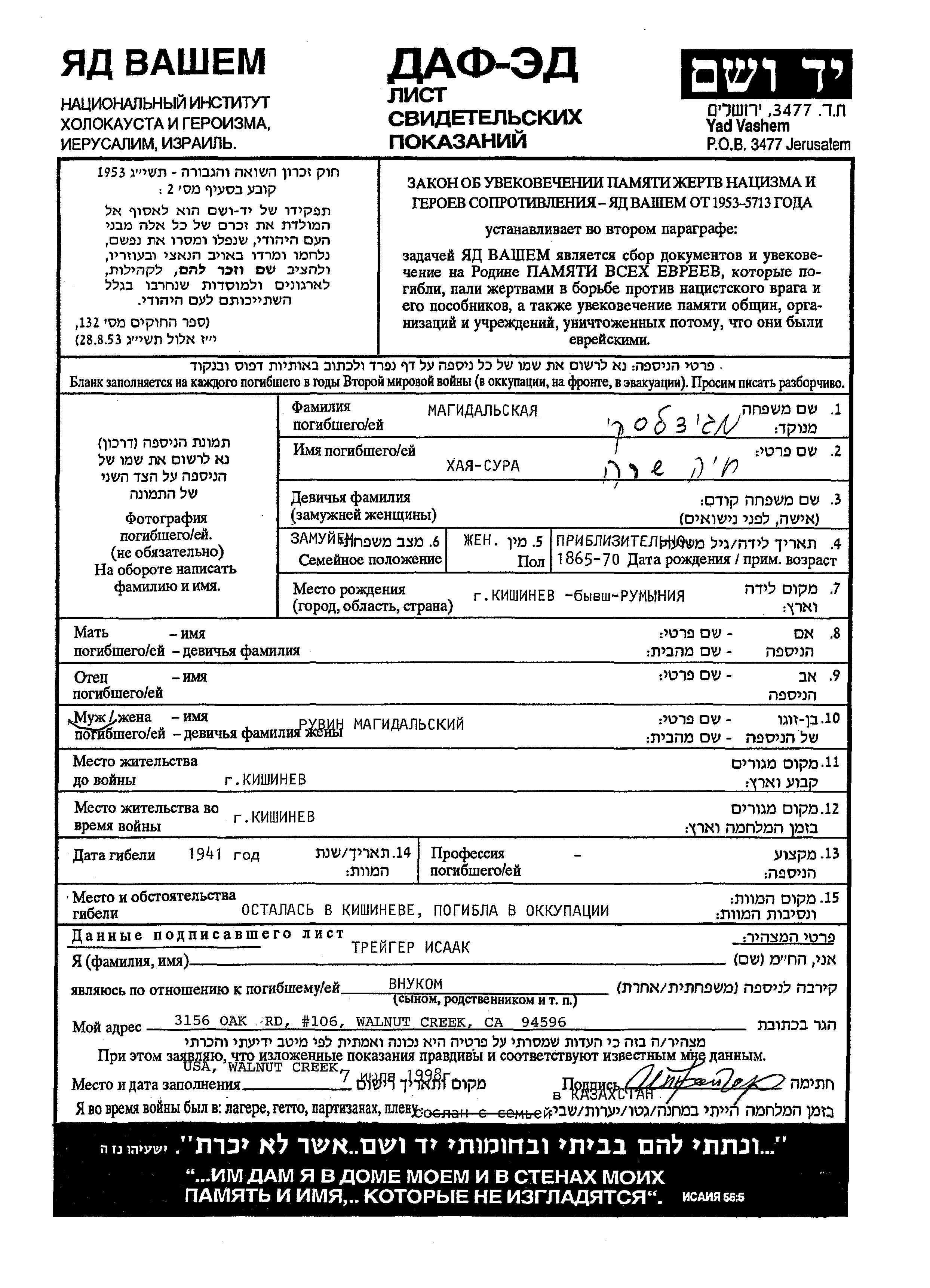 Магидальски Хая Сура 1856 Кишинёв, Румыния Лист свидетельских показаний