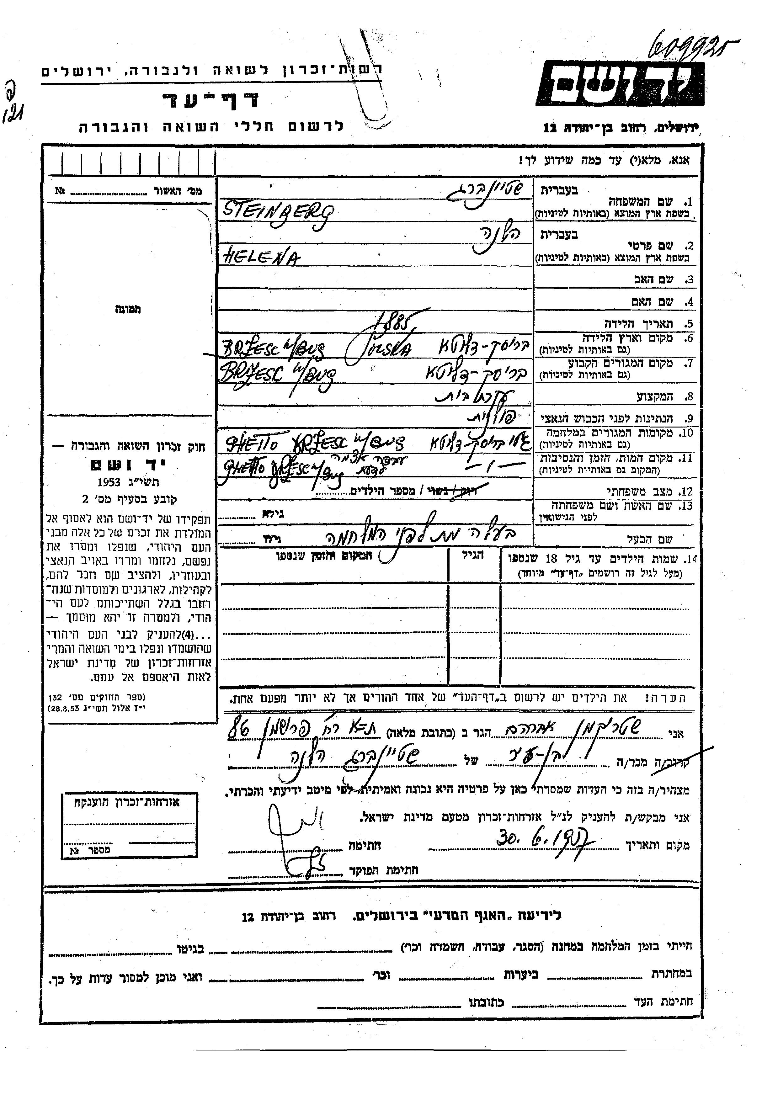 Хелена Штайнберг, место рождения: Брест Над Бугом, Польша. Домохозяйка. Вдова. Место жительства до войны: Брест Над Бугом, Польша. Место во время войны: Брест Над Бугом, Польша.