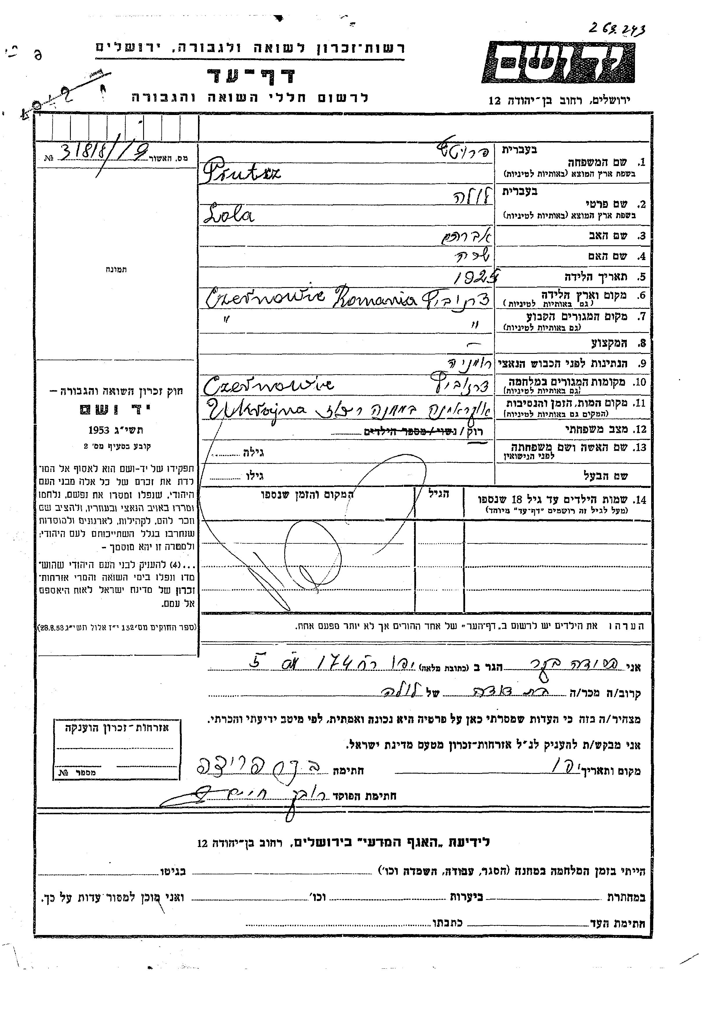 Пруч Лола 1925 Черновцы, Румыния Лист свидетельских показаний
