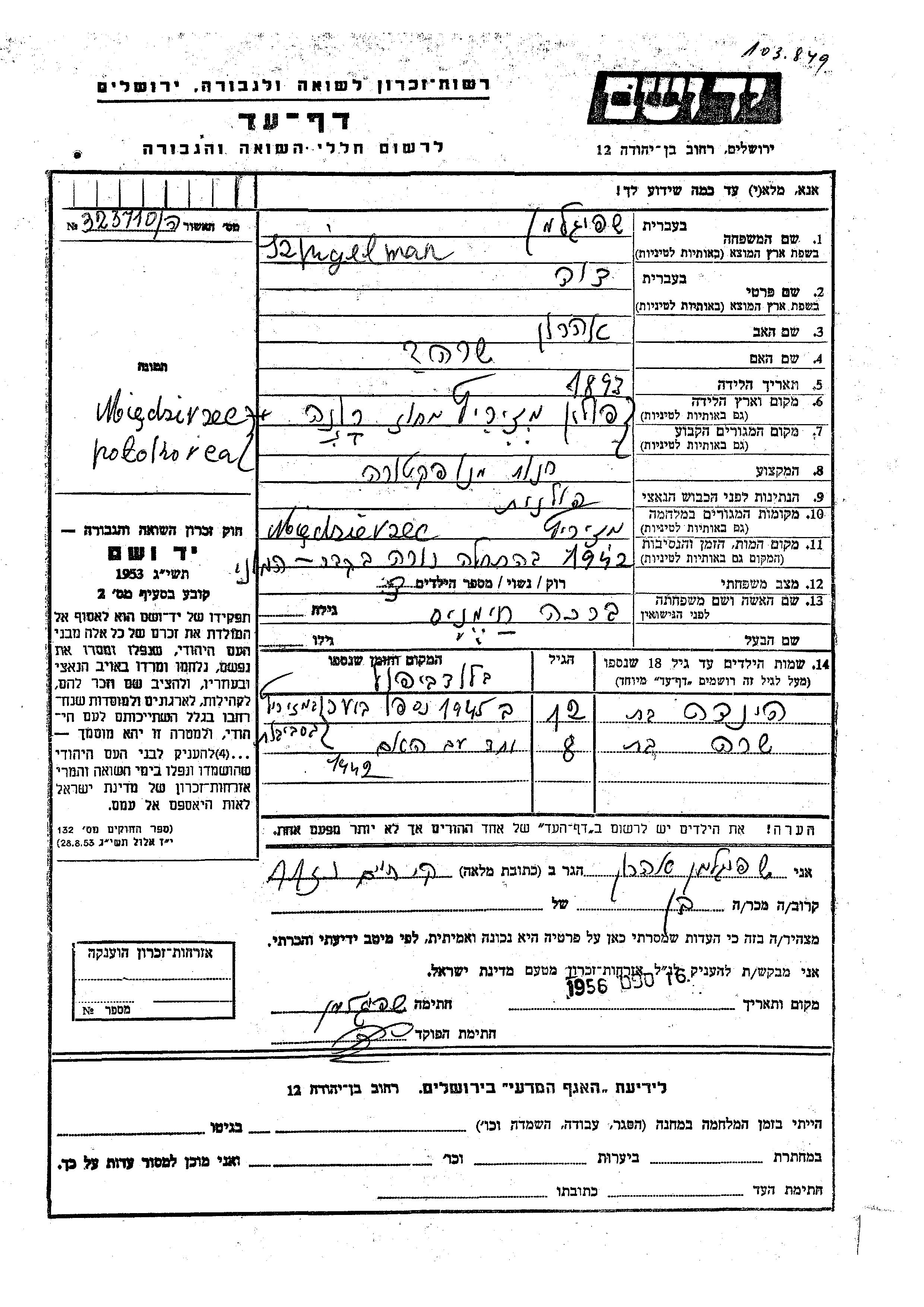 Давид Шпигельман, место рождения: Мендзыжеч, Польша. Отец: Арон, mать:Сара. Женат / замужем. Место жительства до войны: Мендзыжеч, Польша. Место во время войны: Мендзыжеч, Польша.