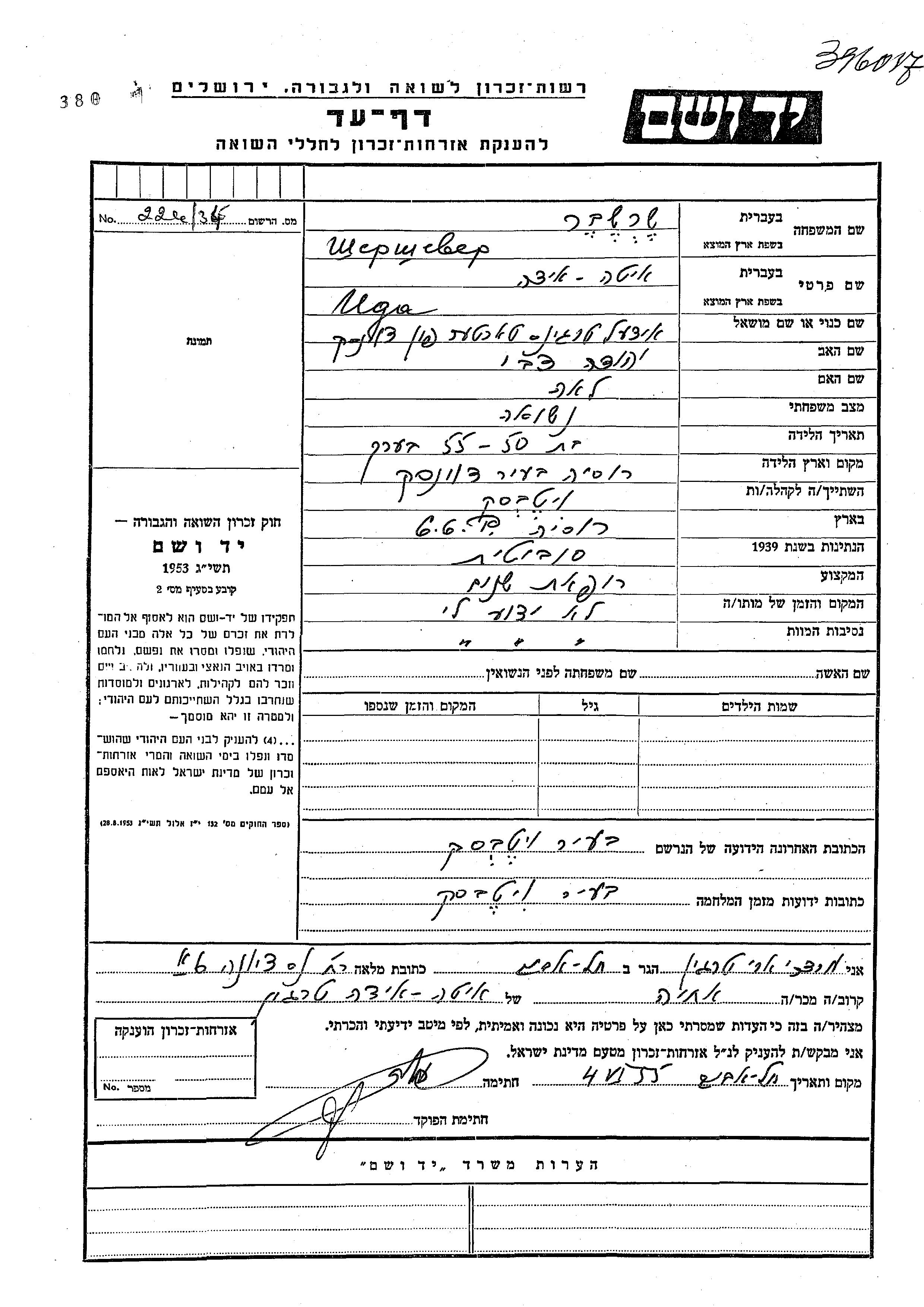 Ида Ита Шершевер, девичья фамилия Тарагин, место рождения: Двинск, Латвия. Отец: Иегуда Цви, mать:Лея. Зубной врач. Место жительства до войны: Витебск, Белоруссия (СССР). Место во время войны: Витебск, Белоруссия (СССР). Ида Ита уничтоженa в период Шоа.