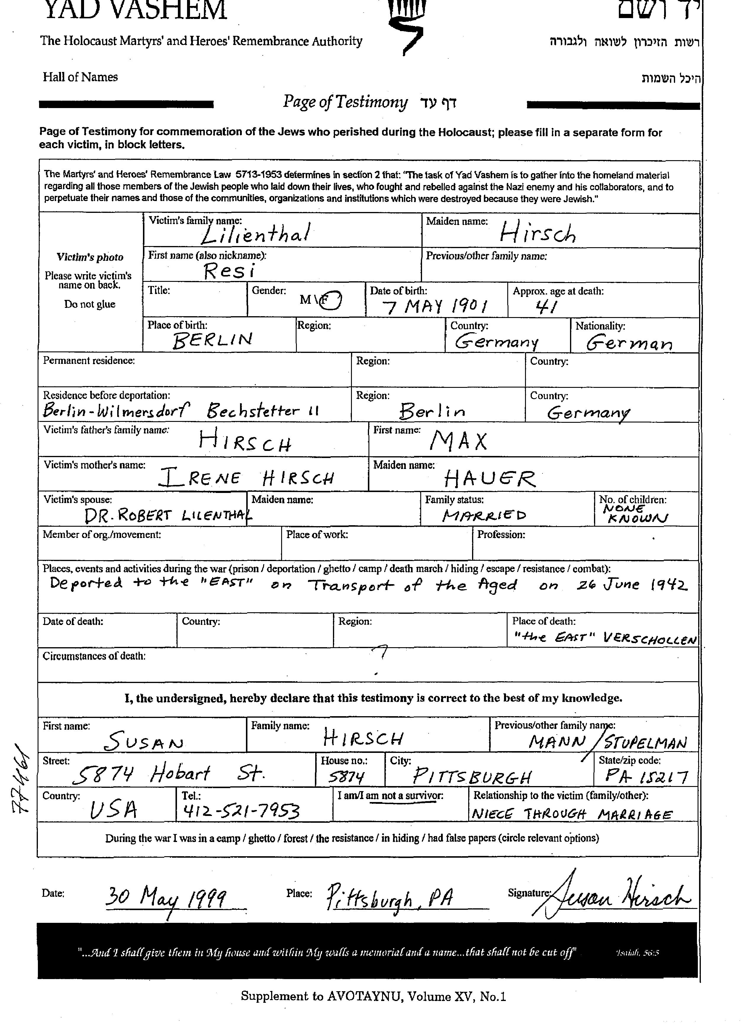Рези Лилиенталь, девичья фамилия Хирш, место рождения: Берлин, Германия. Отец: Макс, mать:Ирене. Женат / замужем. Место во время войны: Берлин, Германия.