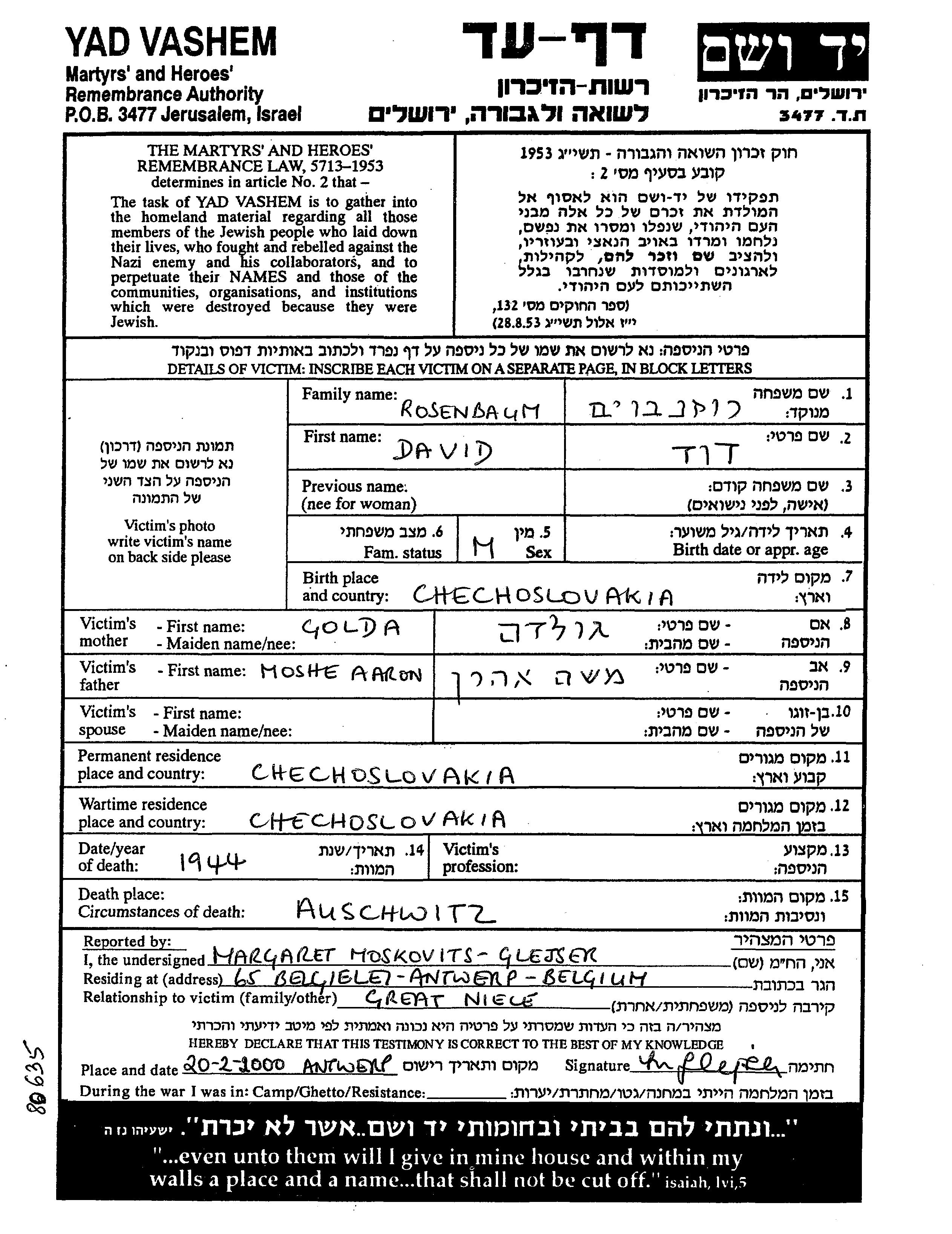 Давид Розенбаум, место рождения: Чехословакия. Отец: Моше Аарон, mать:Голда. Место жительства до войны: Чехословакия. Место во время войны: Чехословакия.