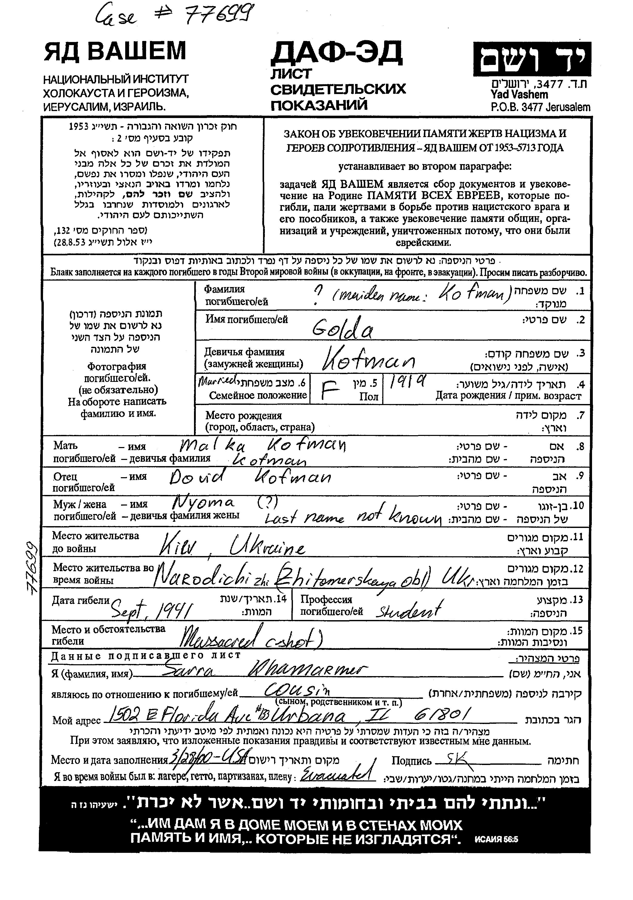 Голда Фамилия неизвестна, девичья фамилия Кофман. Отец: Давид, mать:Малка. Студент / студентка. Женат / замужем. Место жительства до войны: Киев, Украина (СССР). Место во время войны: Народичи, Украина (СССР).