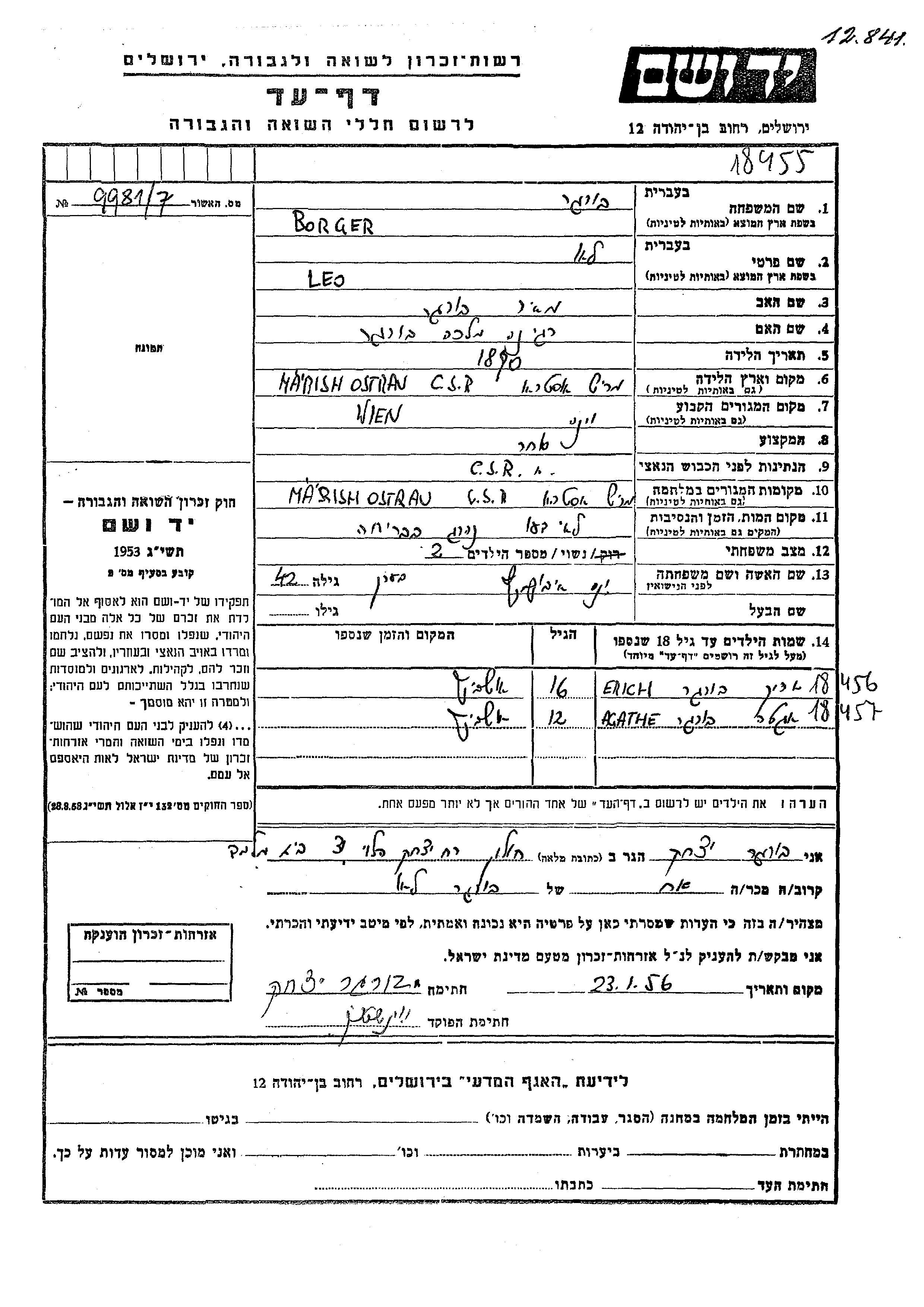 Лио Бургер, место рождения: Мериш-Острау, Чехословакия. Отец: Меир, mать:Регина Малка. Торговец / торговка. Женат / замужем. Место жительства до войны: Вена, Австрия. Место во время войны: Мериш-Острау, Чехословакия.