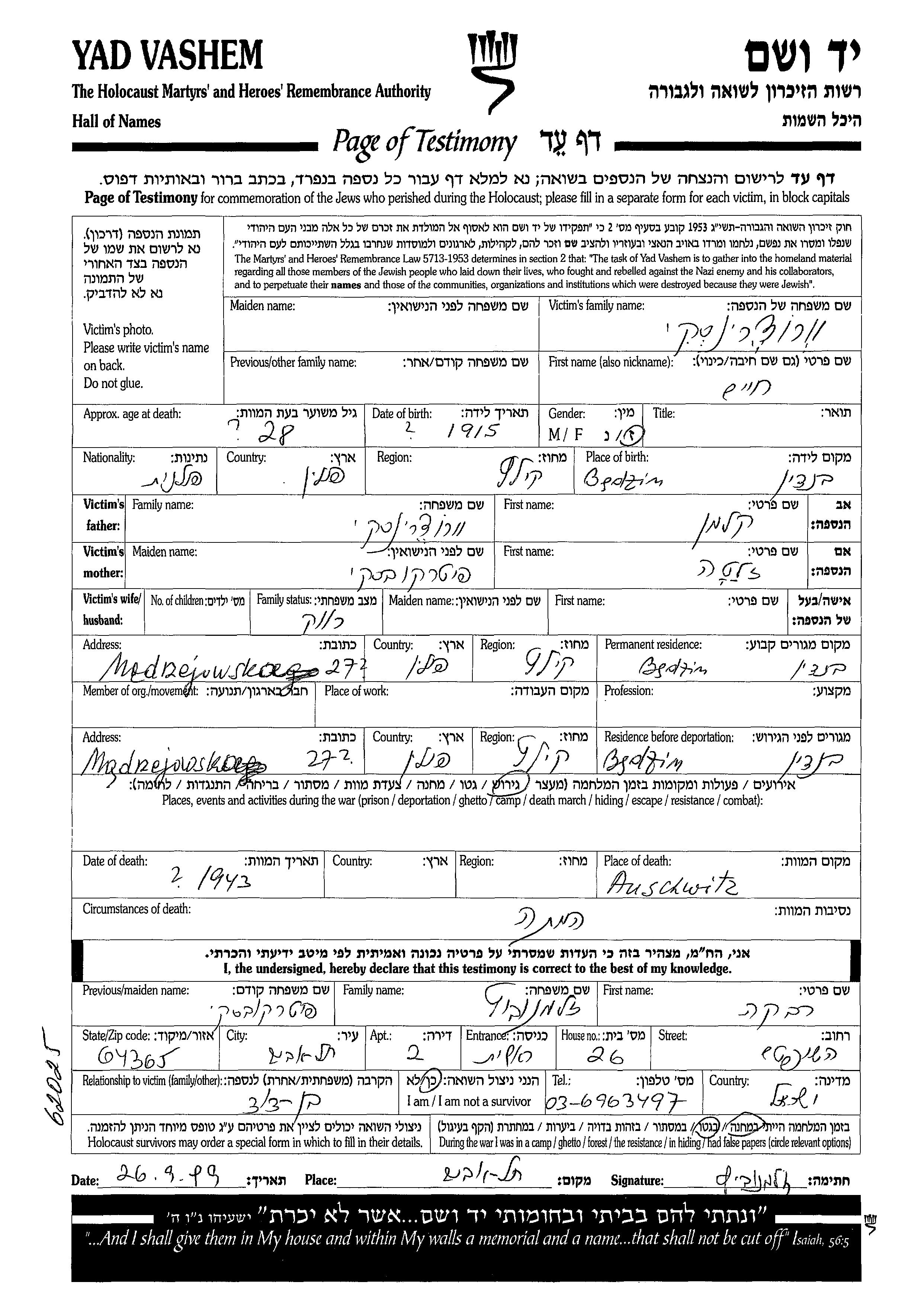 Врочеринский Хаим 1915 Бендзин, Польша Лист свидетельских показаний