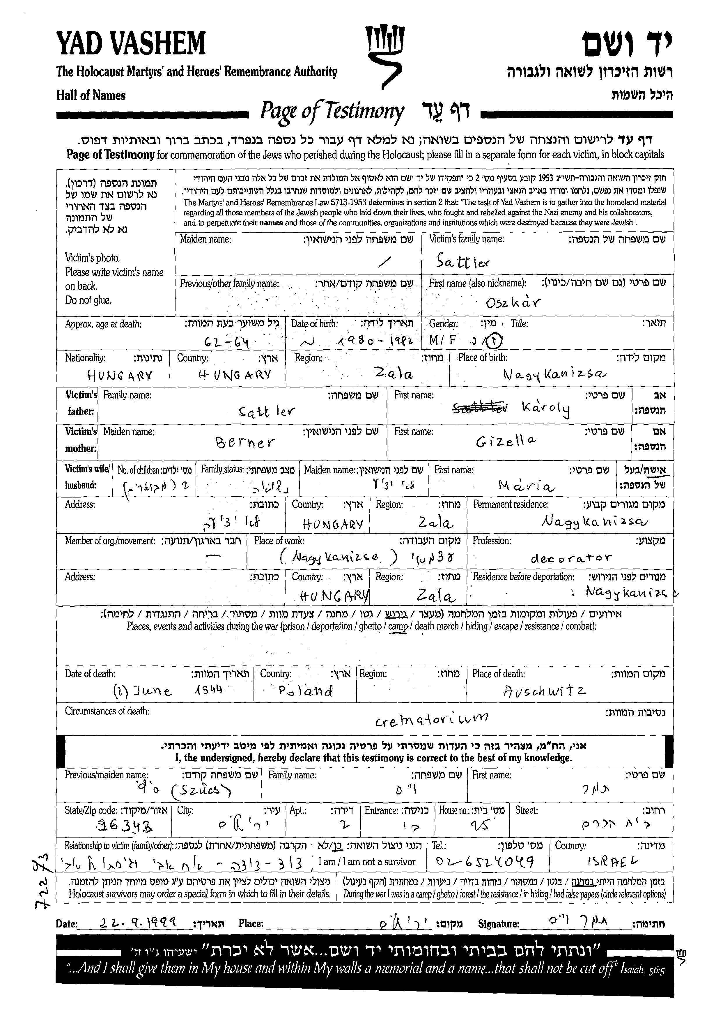 Оскар Заттлер, место рождения: Надь Канижа, Венгрия. Отец: Карой, mать:Гизелла. Дизайнер. Женат / замужем. Место жительства до войны: Надь Канижа, Венгрия. Место во время войны: Надь Канижа, Венгрия.