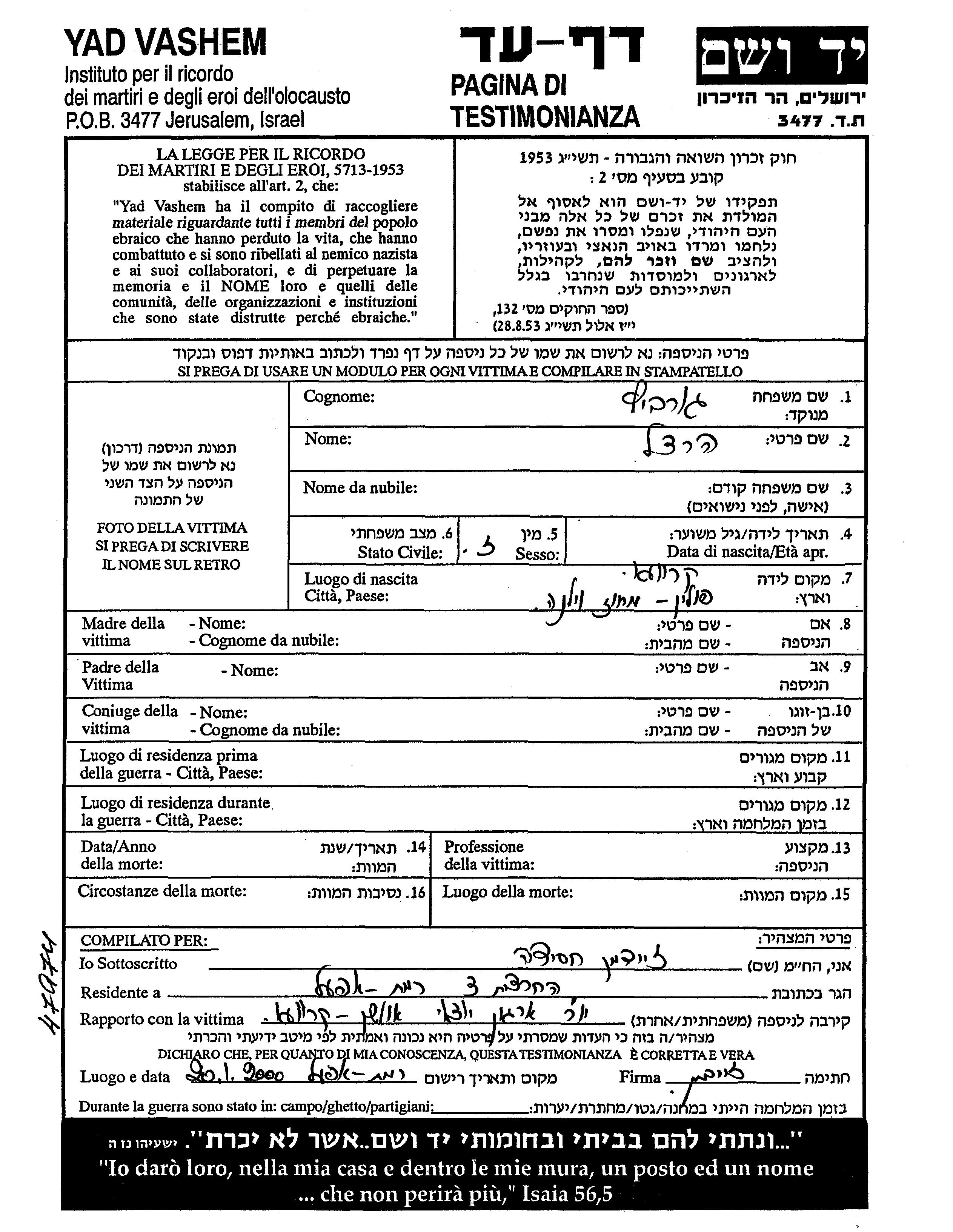 Яд Вашем - Листы свидетельских показаний Мемориального фонда