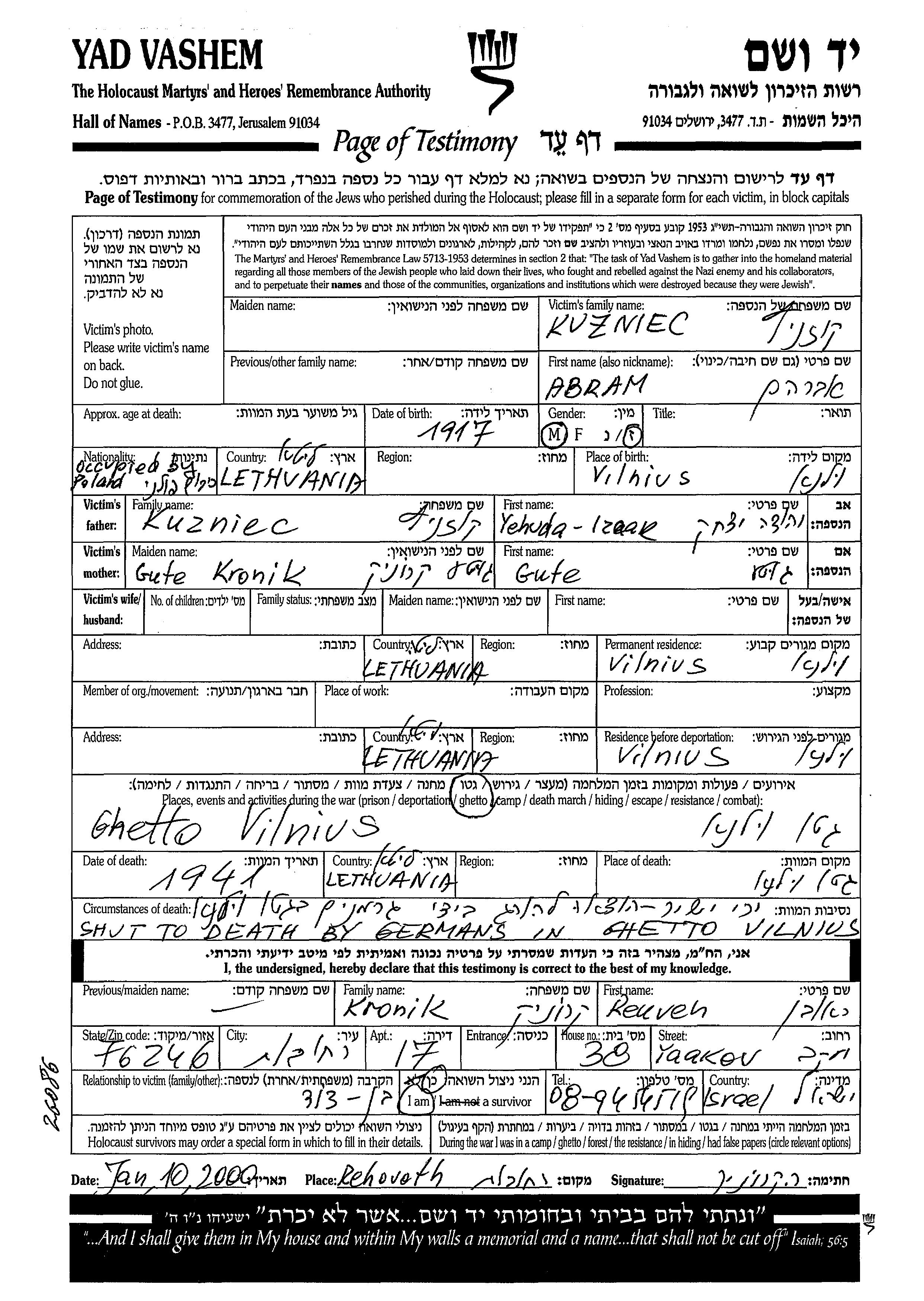 Абрам Кузнец, место рождения: Вильнюс, Польша. Отец: Иегуда Изаак, mать:Гуте. Место жительства до войны: Вильнюс, Польша. Место во время войны: Вильнюс, Польша.